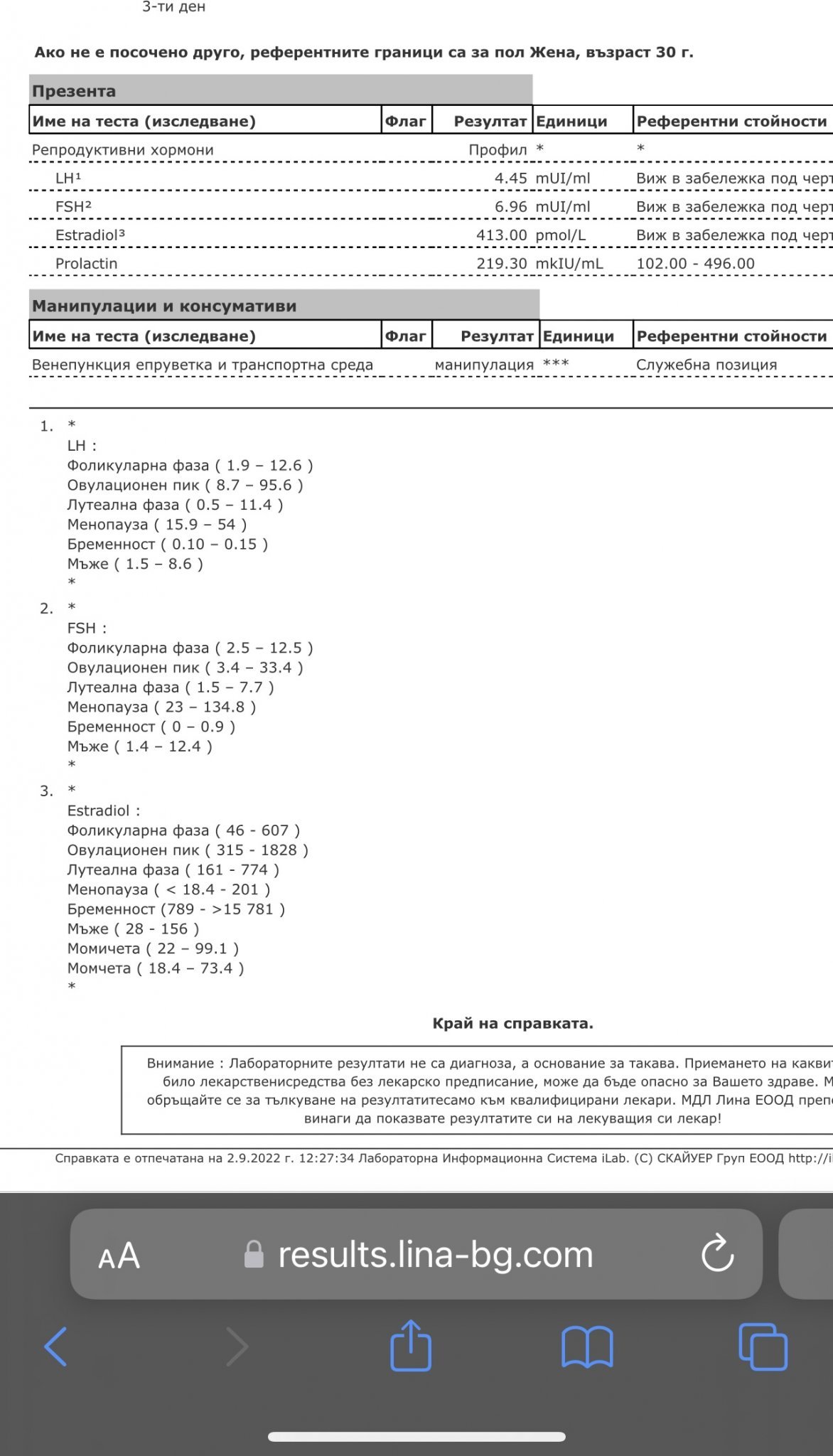 Здравейте! Май не съм за тази тема, но не намерих друга активна. Аз съм на 30г, днес си пуснах изследвания на хормони. В момента съм 3ти ден в цикъл. Някой може ли да съдейства с разчитане на резултатите, понеже ще мине време преди да отида да ги покажа на лекарката. Поразрових си и всъщност май само този Естрадиол е високичтк за ден 3 , макар и в норма по референтни стойности. Като цяло цикъла ми е супер редовен(пу-пу) . Миналият месец беше доста слабичък и по този повод пуснах изследванията. Ето ги: