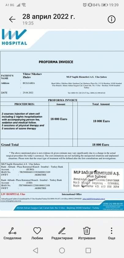 Здравейте, на всички потребители на сайта! Обръщам се към Вас със огромна молба за помощ! Става въпрос за една майка, един баща, едно семейство и едно много желано, обгрижвано, обичано и слънчево детенце! Виктор Николаев Желев е на 2 годинки и 2 месеца от гр. Бургас. Той е нашето съкровище. На 18.04.2022г. постъпва в детска болница "Иван Митев" гр. София по съвсем друг повод, но изключително  неочаквано, тъй като досега детето няма абсолютно никакви симптоми, лекарите му поставиха диагнозата "мускулна дистрофия" - рядко генетично заболяване, което ако не бъде лекувано прогресира бързо и заплашва да остави ангелчето ни парализирано. В България лечение за това заболяване обаче няма. След първоначалния шок и ужас, от семейството се свързахме с "Liv Hospital"  гр. Истанбул, Турция, където по тяхно искане изпратихме епикризата и видео как се движи детето. Проф. д-р Ердал Карайоз (ръководител на отдел Стволови клетки и регенеративна медицина) разгледа всичко и назначи лечение с  вливки на стволови клетки, озонотерапия и физиотерапия, които могат да стопират прогреса на болестта. За целта Вики и родителите му трябва да заминат на 10.05.2022г. Първоначалната необходима сума, за да започне лечението е 19 600 евро, които за съжаление обаче са крайно непосилна сума за нас. Тя включва - лекарски консултации, кръвни тестове, биопсия, 2 вливки на стволови клетки през 15 дни, 5 озонотерапия и 5 физиотерапии, както и престоя им в болницата. Сумата трябва да бъде преведена на болницата най-късно на 06.05.2022г. Състоянието му ще бъде проследявано в рамките на един месец, след което лекарите ще преценят как да продължи лечението му. От семейството му открихме дарителска сметка, много познати се включиха в каузата на Вики, направиха страница и група във Фейсбук, където дори организираха базар за неговото лечение, но за съжаление средствата пристигат много бавно и почивните дни допълнително забавят нещата, а времето ни притиска. Молбата ми към Вас е  всеки, който може да ни помогне за събирането на средствата или да сподели със свои близки, приятели или в социалните мрежи историята на нашия малък ангел, за да може да стигнем до повече хора, защото никое дете не заслужава детството му да бъде помрачено от такава коварна болест! От името на семейството и на малкия Виктор искам да Ви изкажа огромна Благодарност! Искрено вярваме, че има добри и състрадателни хора, които могат да ни помогнат. Това е дарителската сметка на Вики, прикачам ви също снимки на офертите от болницата в Турция, както и снимки на нашия малък боец! Също така можете да ни намерите и във Фейсбук на страницата Щастие за Виктор - благотворителен базар