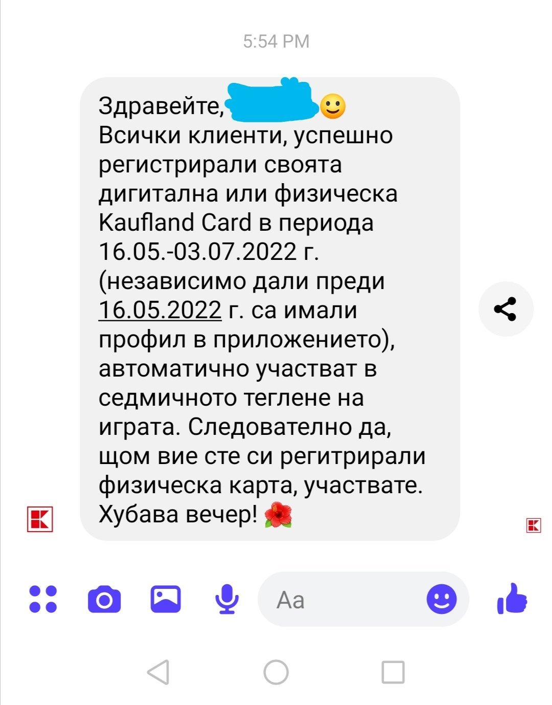 Във връзка с Вашето запитване бихме искали да Ви информираме, че имаме решение всички клиенти, които са регистрирали Kaufland Card преди 12.05. да не участват в играта, тъй като преди това лоялната програма беше в тестова фаза и не е била публично обявявана.