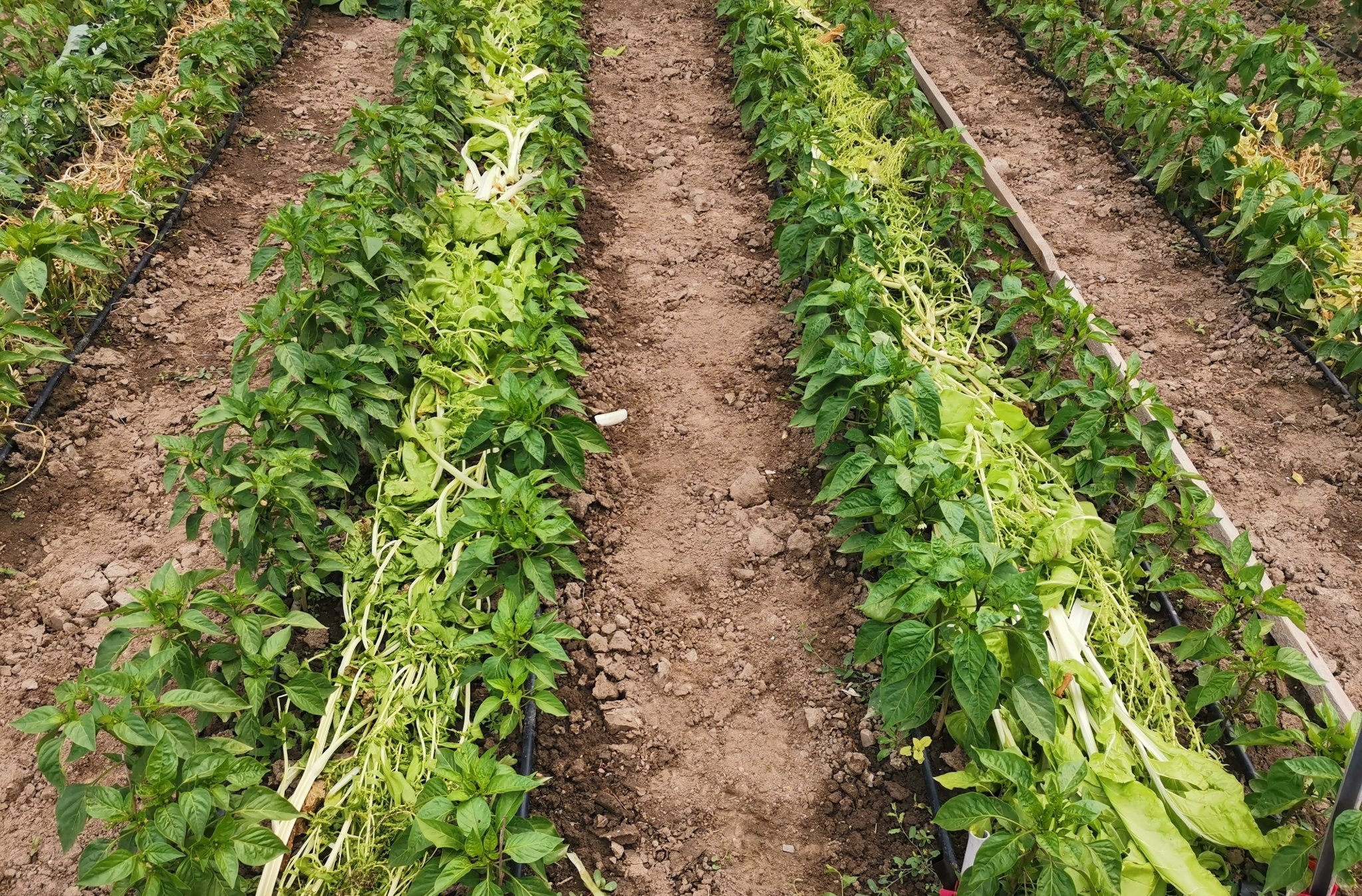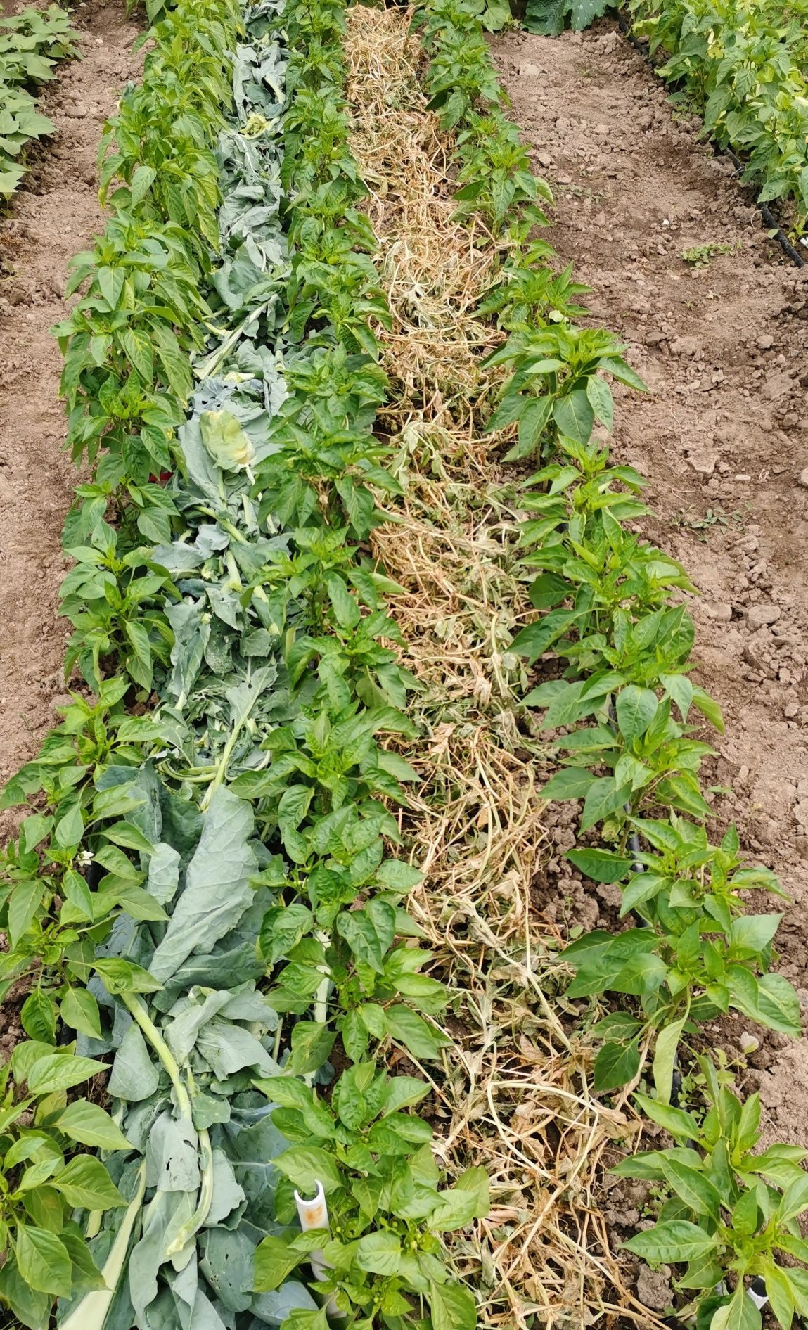 Използвах остатъците от оскубаните зеле, манголд и грах между редовете на пипера: