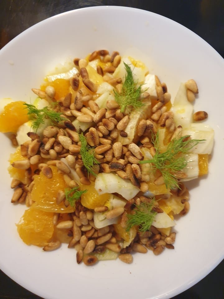 Фенел, портокал, кедрови ядки запечени на тиган. Подправих с много малко сол, бял балсамико оцет и зехтин.