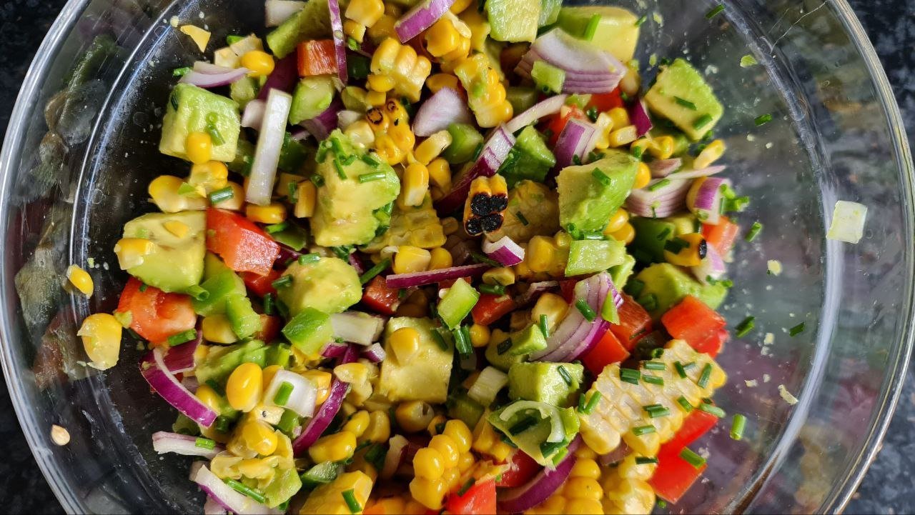 печена царевица, авокадо, червен лук, зелена и червена чушка/може и люти/
