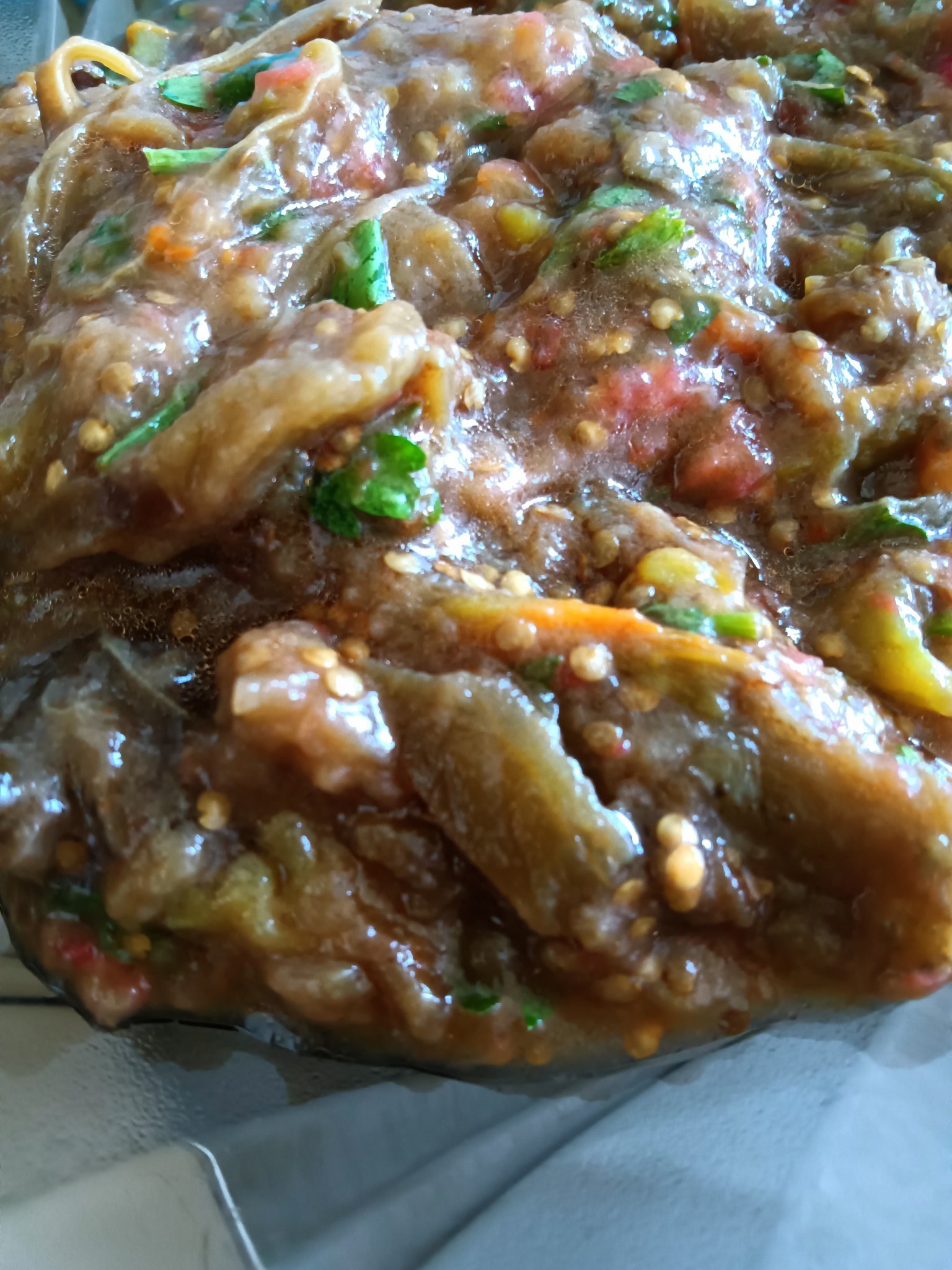 Ето така изглежда моето кьопоолу от днес. Приготвено е по традиционната ни семейна рецепта - без други зеленчуци, освен патладжана. Овкусено е с олио, оцет, сол, чесън и кисело мляко.