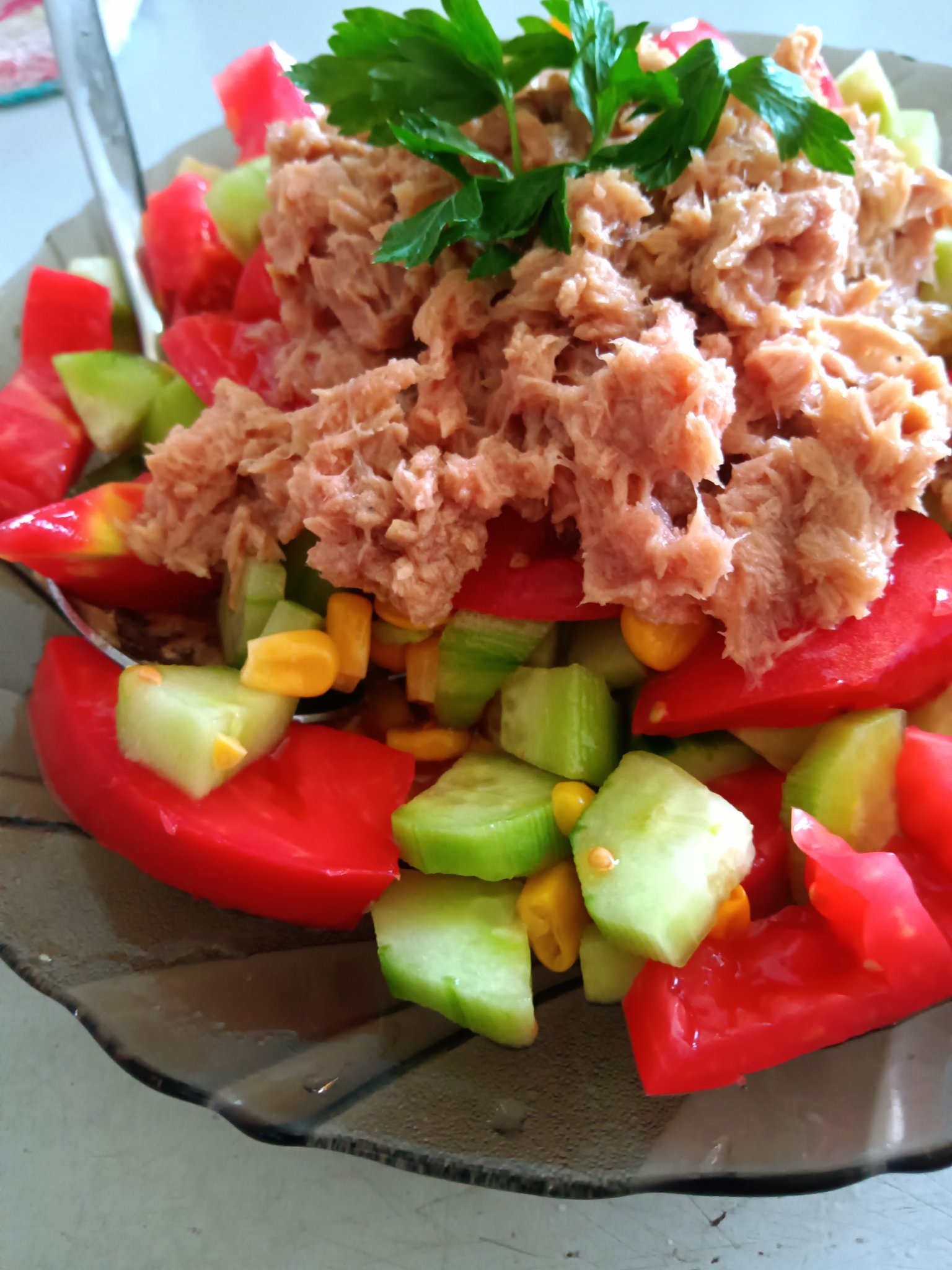 Краставици, домати, царевица,лук, риба тон,олио,лимон, магданоз