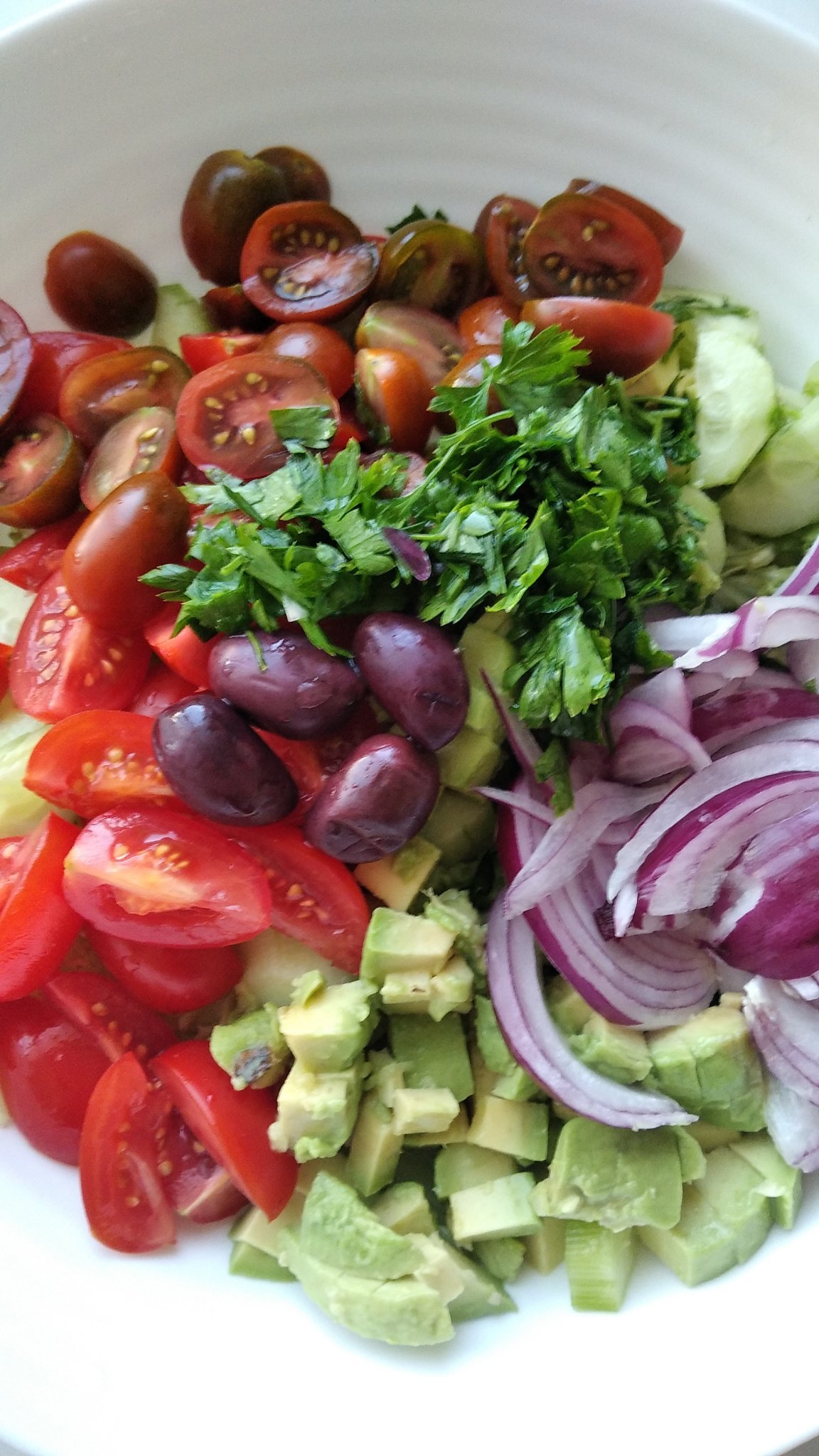 Свежа и лека салата от градински домати, краставици,сиврия и магданоз овкусени само със сол, олио и оцет
