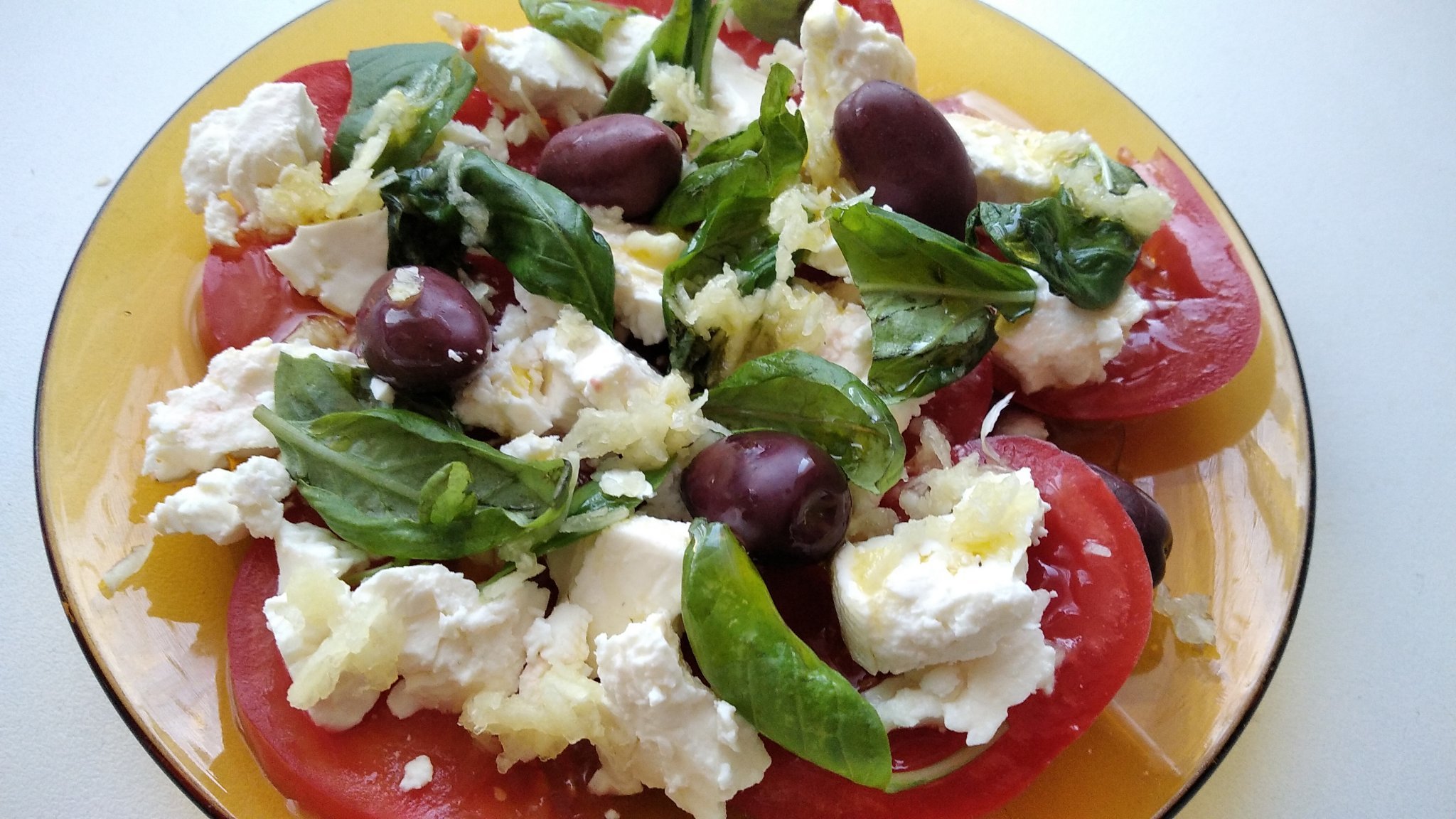 Домати със сирене, чесън и пресен босилек, малко зехтин, маслини.