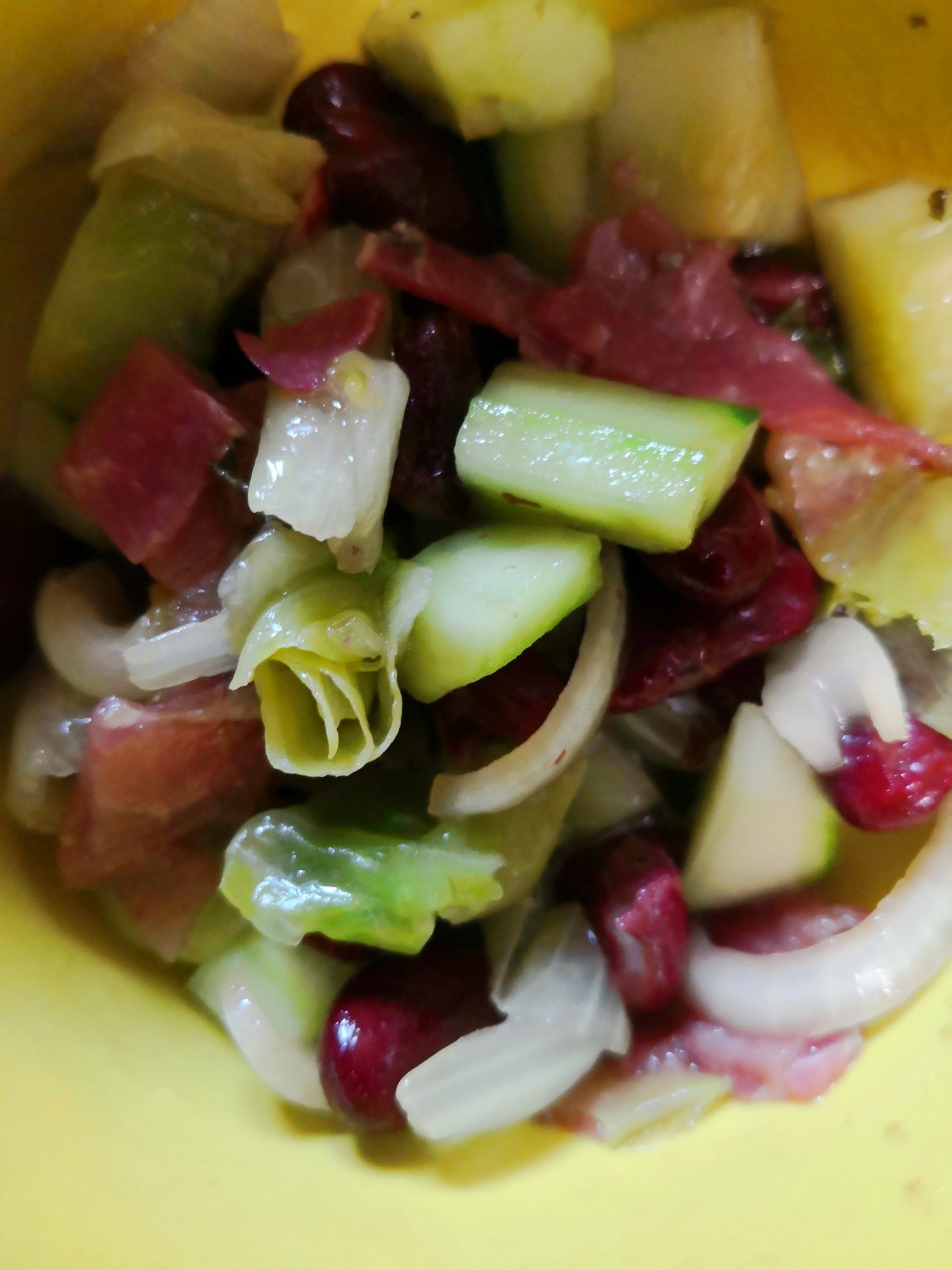 Айсберг, лук(хубаво е да е червен), репичка, краставици, прошуто(при мен пастърма, че такова имах), червен боб от консерва, с балсамико, олио и сол.
