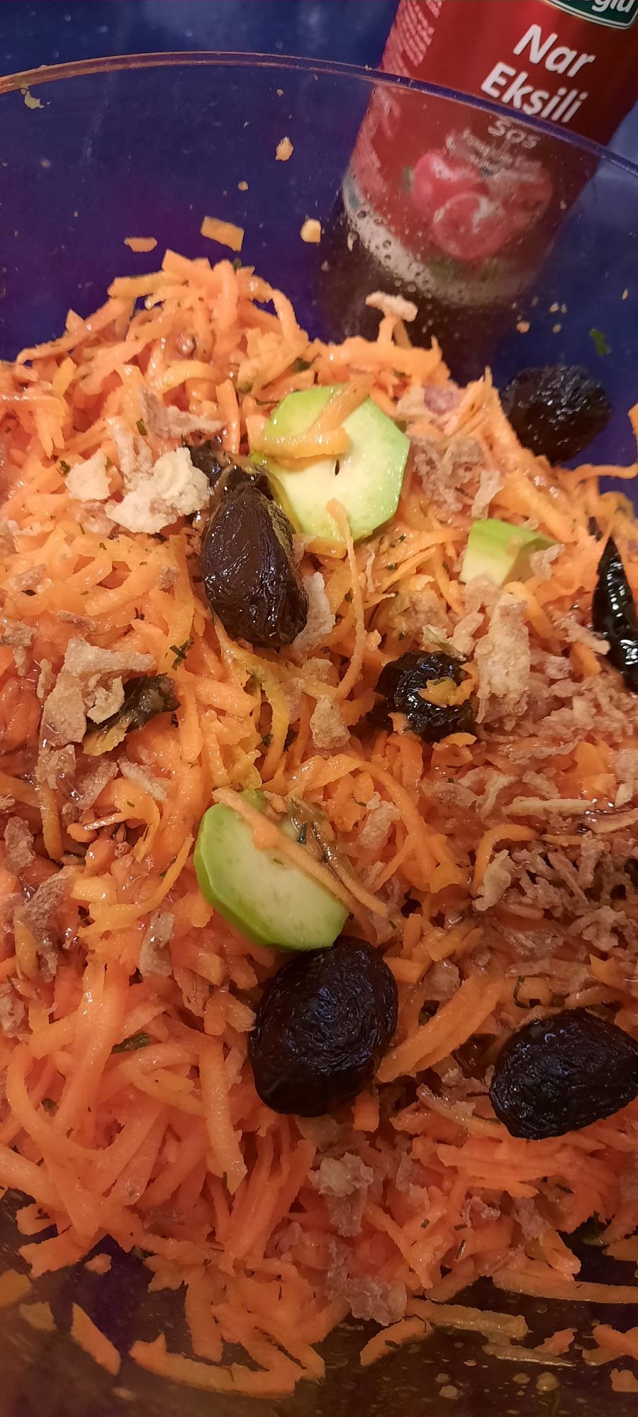 моркови и авокадо, маслини/ сушени сини сливи/ сушено манго / пържен лук от американската седмица в Лидл/ дресинг от зехтин с оцет от манго и нар редукция ..нямаше други продукти а не ми се ходеше по нощите до магазина.