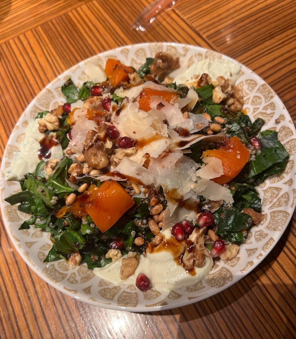 Спанак,киноа,орехи,печена тиква в комбинация със сирене /италианско някакво на мен ми беше тип Филаделфия/ и дресинг с нар