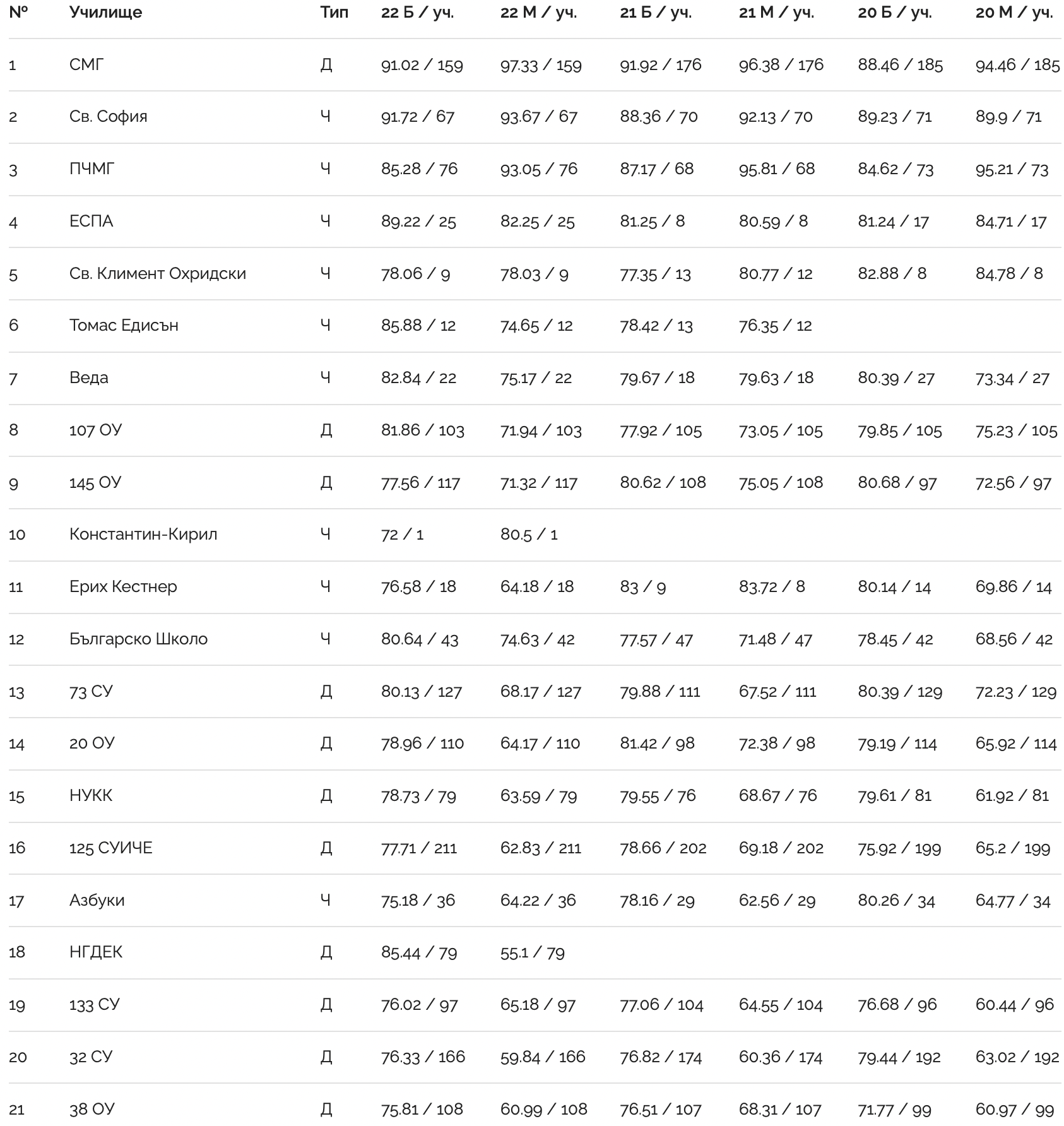 13 73.СУ с преподаване на чужди езици "Владислав Граматик" 74.150 80.13 68.17