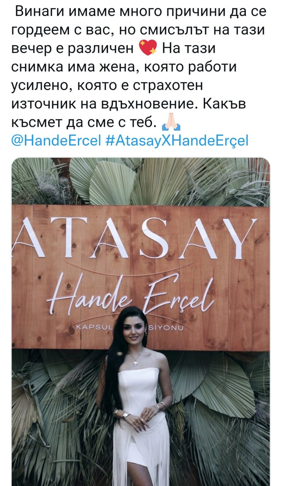 Уникалната колекция, която създадохте със собствените си рисунки и дизайни, тази великолепна реклама, заснета с тях, а вие, която се плъзгате като лебед, докато ги рекламирате и двете, ни изпълвате с гордост и ни стопляте с усмивката си... ♥️ Дано има още много такива нощи заедно. Добре е, че ви има Ханде Ерчел. 🙏🏻