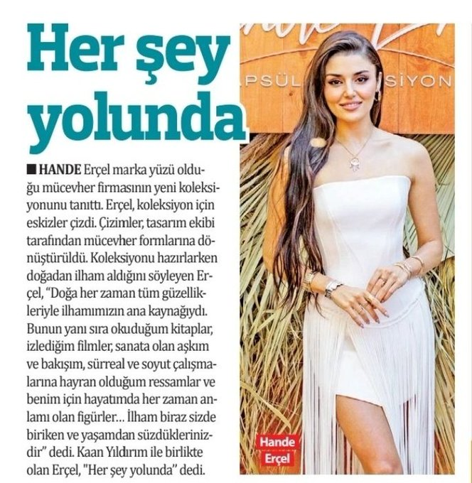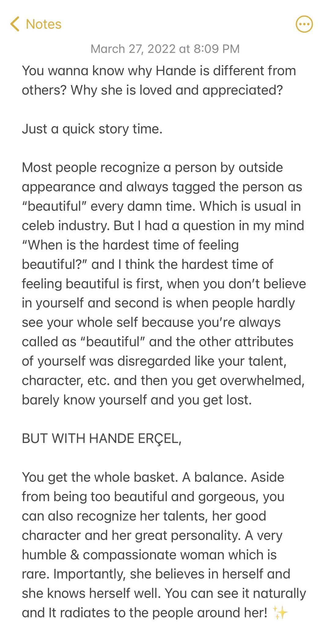 Но с Ханде Ерсел получаваш цяла кошница. Баланс. Освен че e твърде красива и прекрасна, можете да разпознаете и талантите, добрия й характер и страхотната й личност. Много скромна и състрадателна, което е рядкост. Важното е, че тя вярва в себе си и се познава добре. Можете да го видите съвсем естествено и то излъчва към хората около нея!"