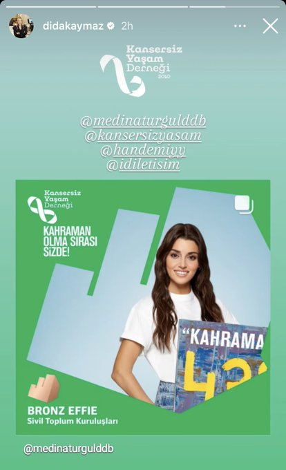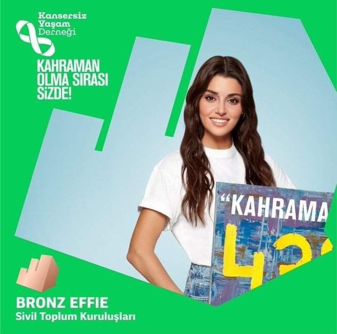 На наградите Effie, известни като Оскарите на рекламата, тазгодишният проект „Твой ред е да станеш герой“ на Асоциацията „Живот без рак“, за който Ханде Ерчел е посланик на добра воля и лице на кампанията, спечели „Бронзовия Effie“ “ в категорията Неправителствени организации.