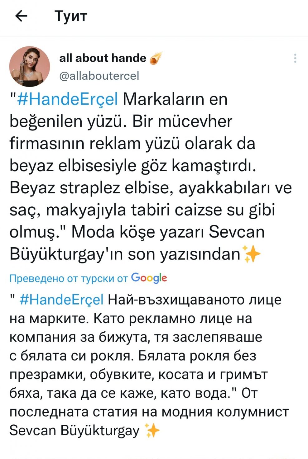 Да ви кажа, до преди известно време се дразних като си позволяват да пишат за Ханде и Керем по другите теми. Повече се е коментирало Ханде като цяло. Но в последно време взе да ми харесва. Цялата тази негативност от турските журналисти, фалшивите профили в Туитър, създадени специално да плюят по нея, пълненето на страници по други теми с Ханде, засилват още повече симпатиите ми към нея.