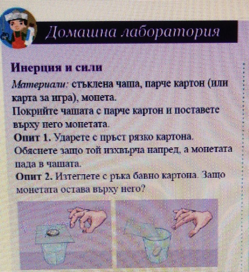 Когато картонът рязко се избие изпод монетата, времето за взаимодействие на двете тела/монета и опората/ е много кратко, следователно малката сила на триене, действаща върху монетата, не може да придаде на последната скорост в хоризонтална посока. На практика монетата запазва състояние на покой и когато опората/картонът се отстрани, тя пада в чашата под влияние на гравитацията.