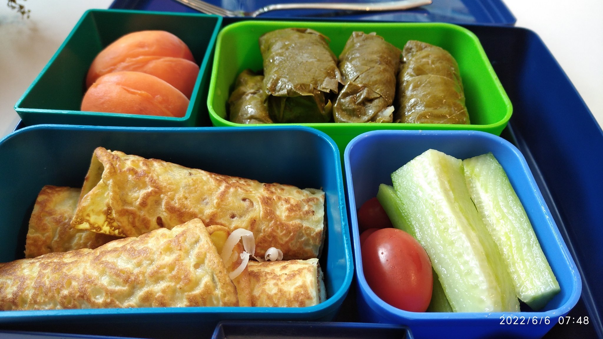 Аз приключих с кутиите в четвъртък.Последно му сложих ориз със зеленчуци,краставица и ядки.