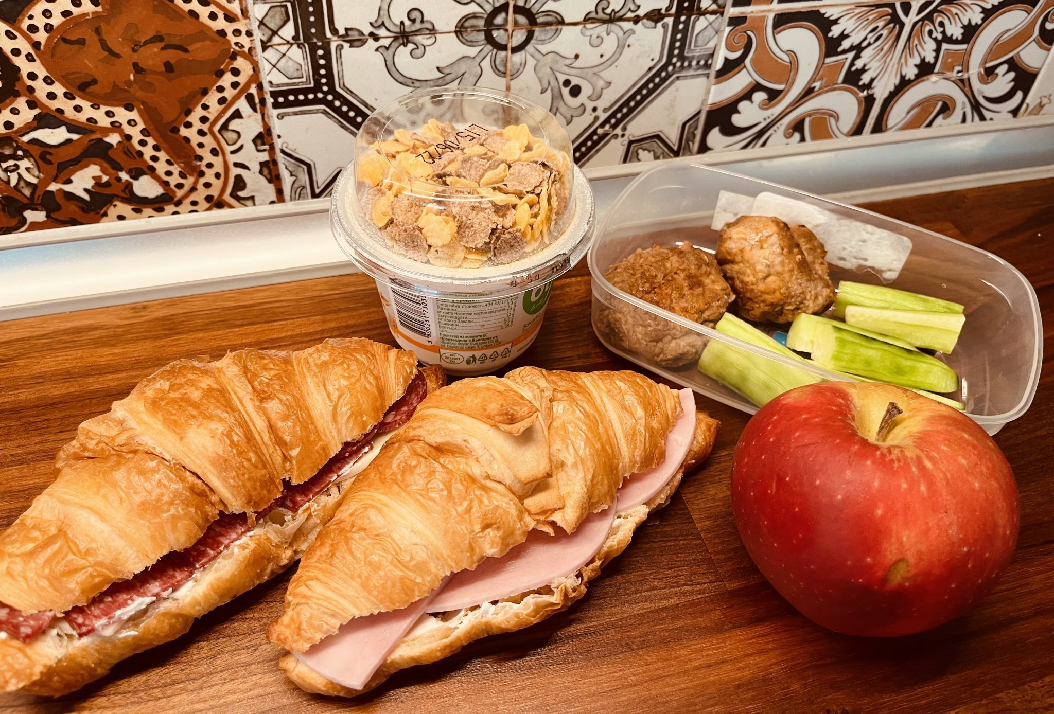 днес - лаваш питка, навита с крема сирене, шунка, краставици, кашкавал, кроасан с масло, ябълка, банан, кремче. напоследък малчо все се оплаква, че не му стига храната. не знам къде го побира това.