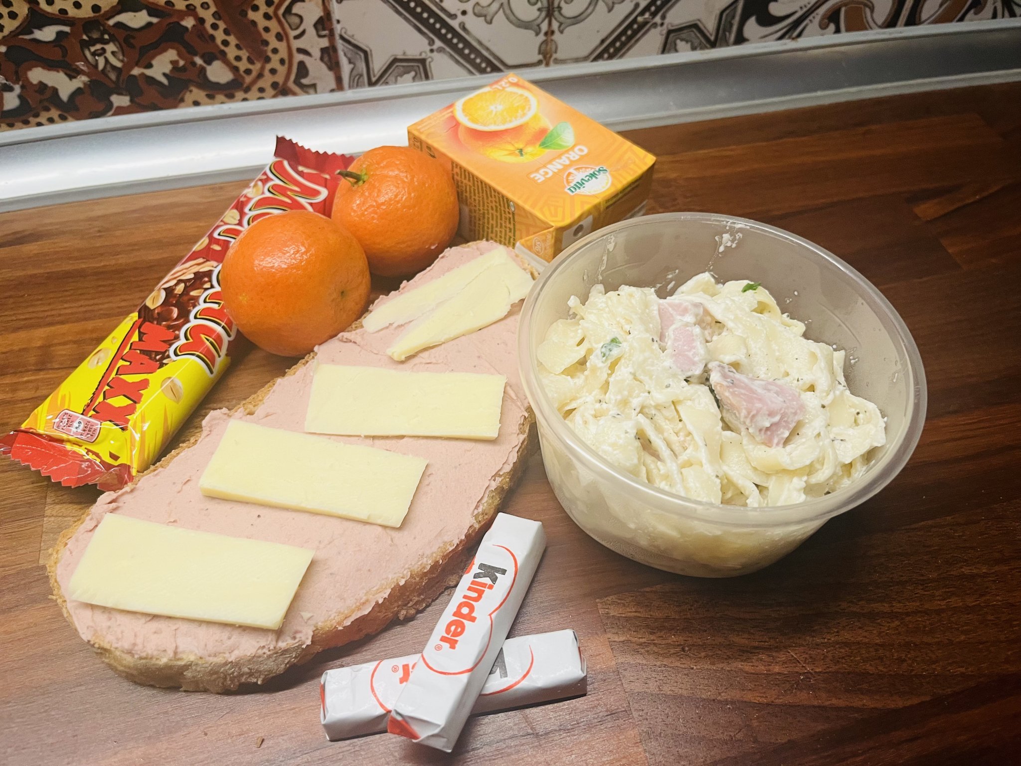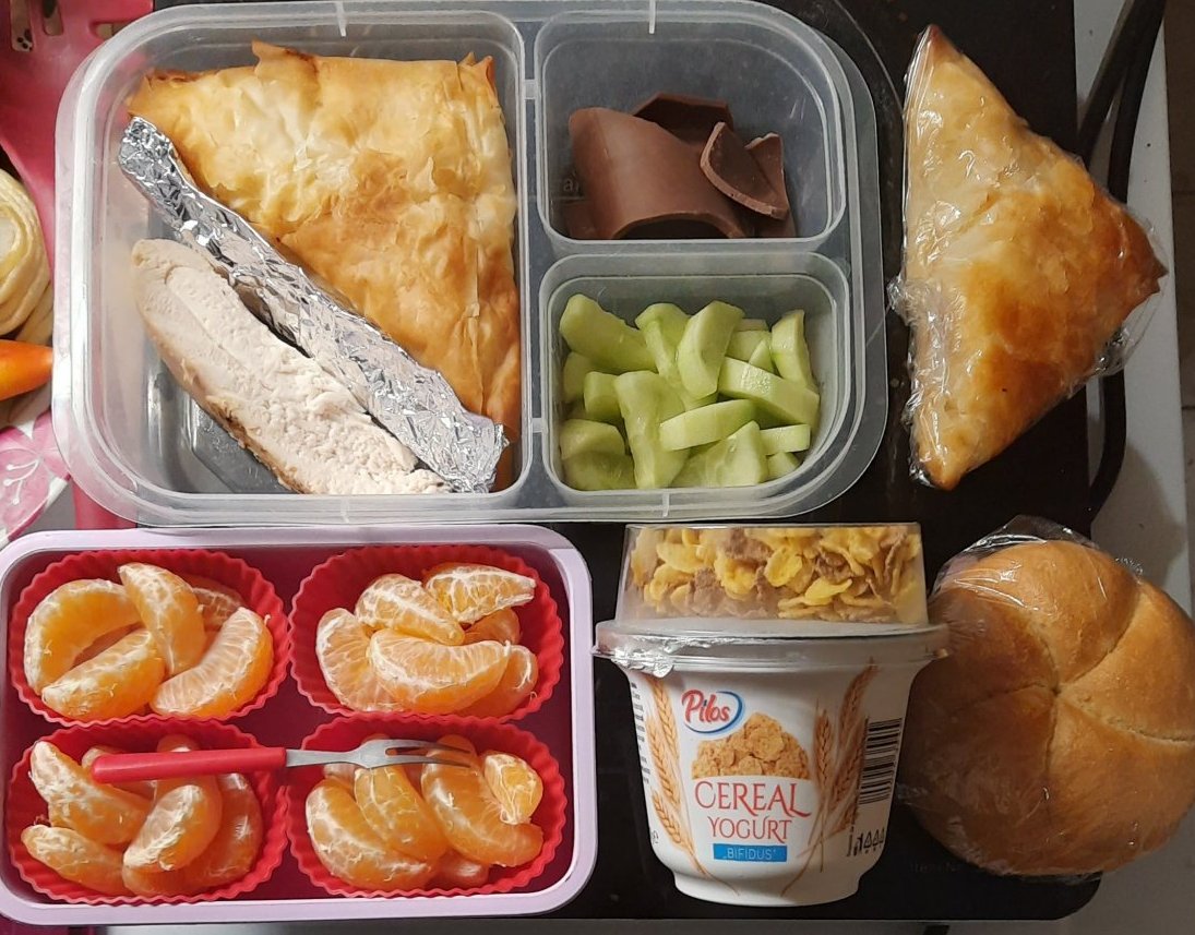 За закуска има различни опции като попара, кроасан с масло, пица, принцеси с кайма, вита баница, кифлички, овесени ядки, ябълка, банан , бисквити и мюсли. За обяд се споменават ястия като мусака със спанак и ориз със свинско месо. След обяд има тостове с различни гарнитури, крем супи, плодове (ягоди и череши), кисело мляко и домашни сладкиши.