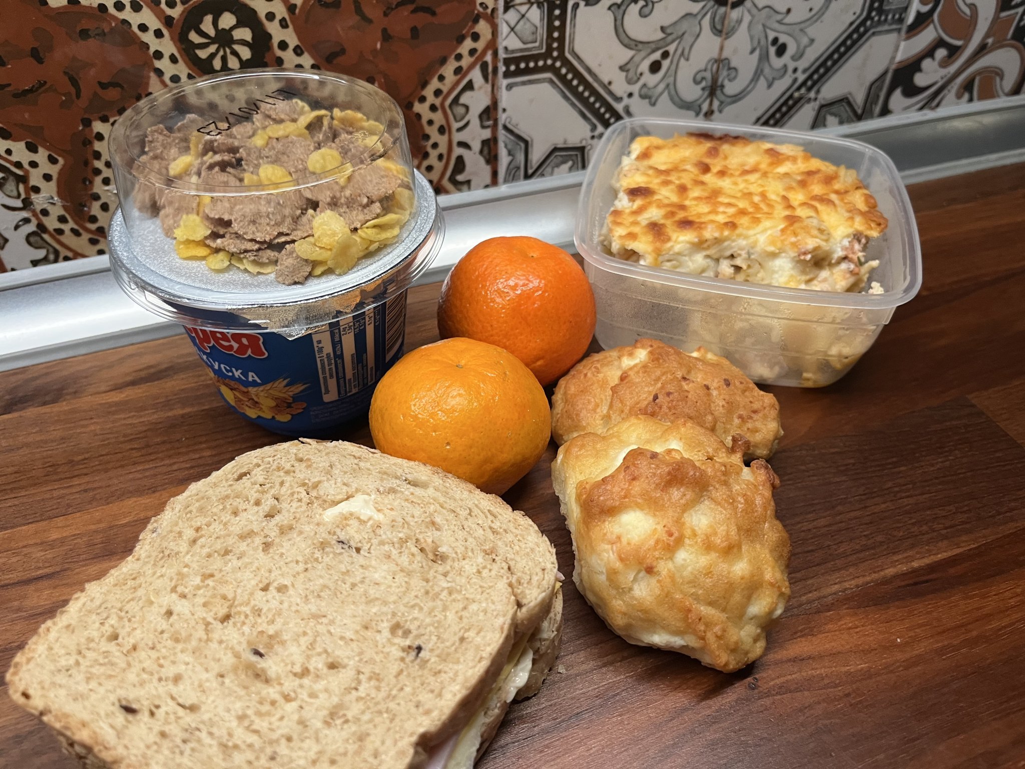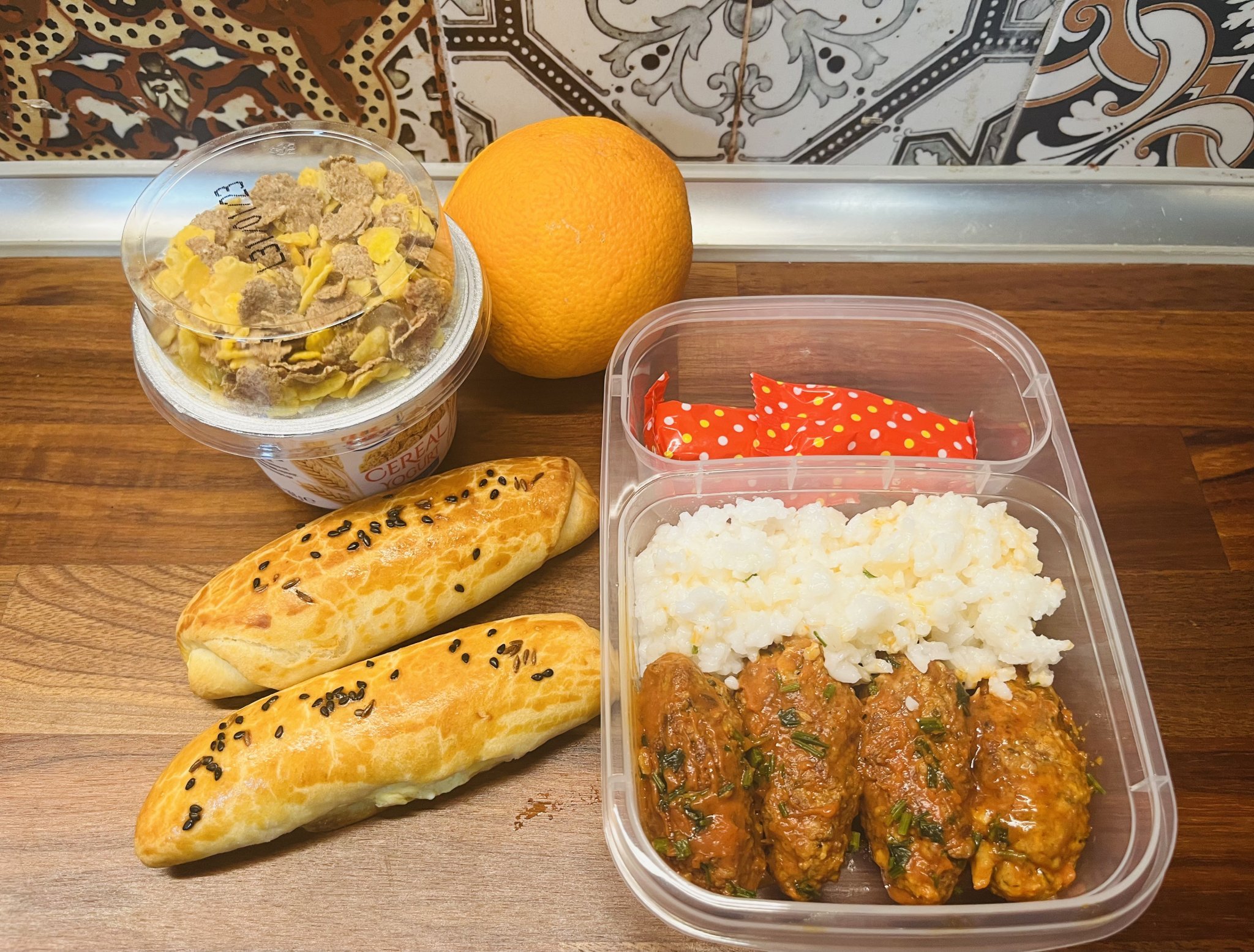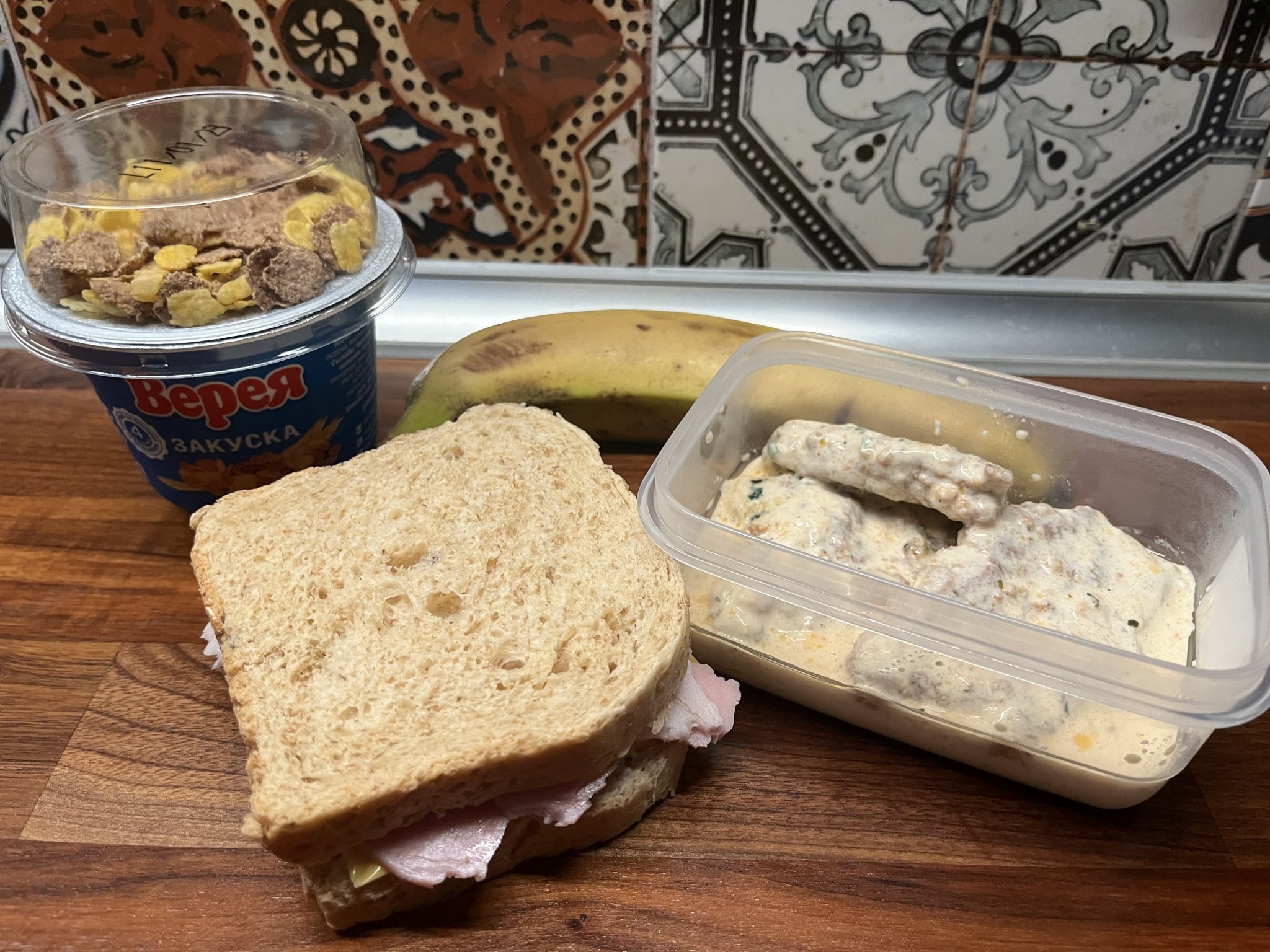 За закуска има различни опции като попара, кроасан с масло, пица, принцеси с кайма, вита баница, кифлички, овесени ядки, ябълка, банан , бисквити и мюсли. За обяд се споменават ястия като мусака със спанак и ориз със свинско месо. След обяд има тостове с различни гарнитури, крем супи, плодове (ягоди и череши), кисело мляко и домашни сладкиши.