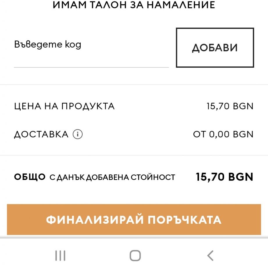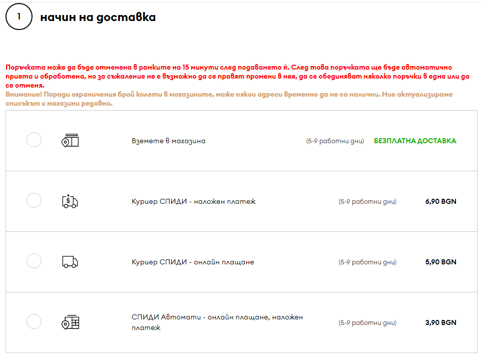 И аз нямам безплатна доставка. Безплатна е до магазина при онлайн плащане, 9 дни за доставка...Но не ме устройва.