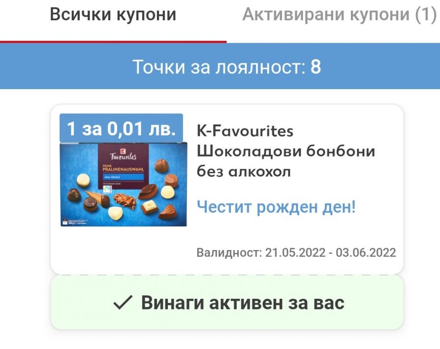 Някой имал ли е случай в който да не може да активира купона на бонбоните полсучай рожден ден за 0.01 лв.? Какво наприхте, за да се отстрани пропуска? Днес реших да се възползвам от подаръка, но ми ги маркираха за 9.99лв.. Отказах ти.