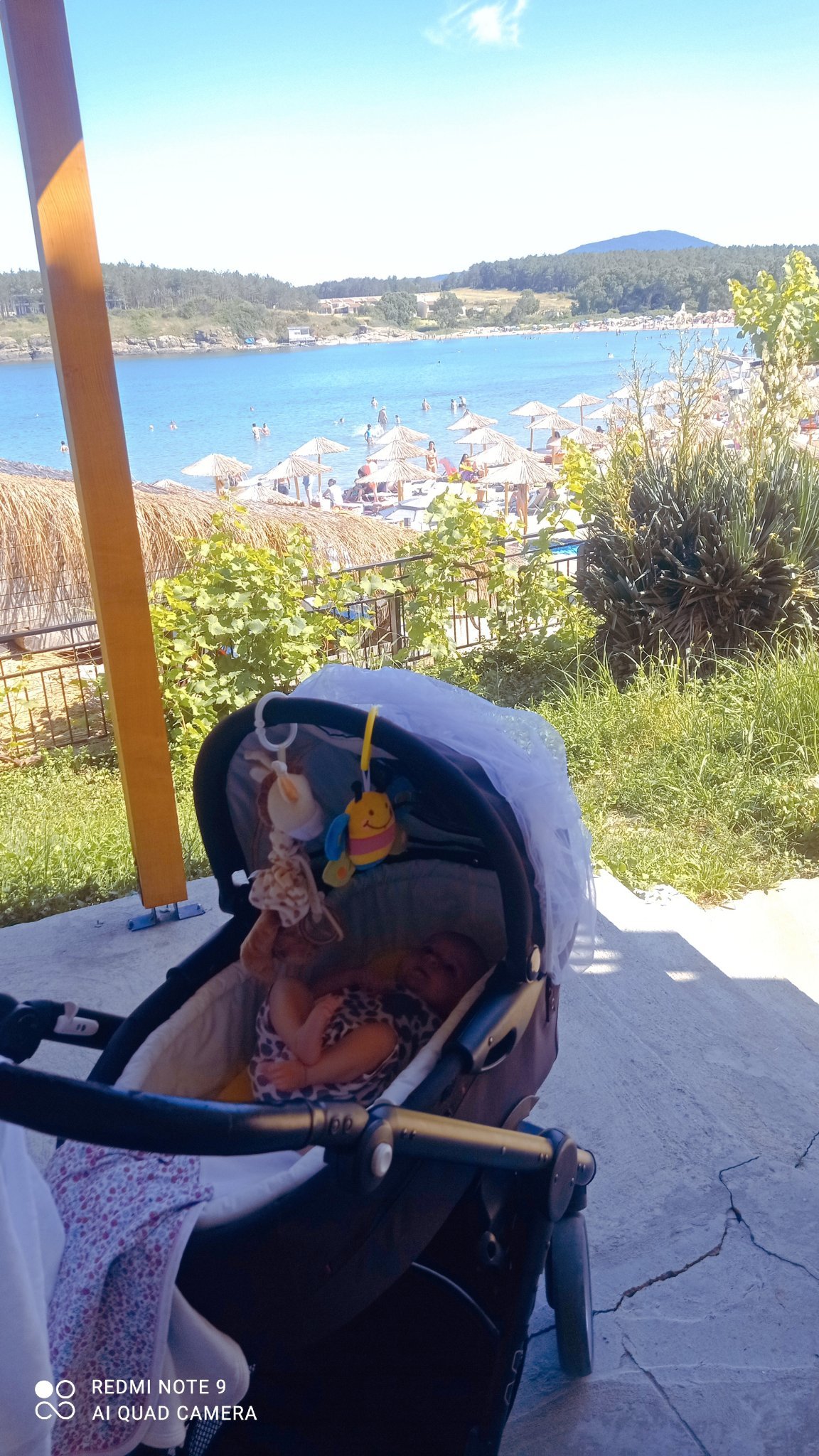 Ние заминаваме на море утре, мисля по боди да я държа или по памперс. И до 11 часа и после след 18 часа да е на плажа, евентуално. Ние спим на 5 метра от плажа. Плана ми е да съм или в ресторанта или в бийч бара, музиката не е силна, тя че може да спи в количката и да е на сянка. Или в краен случай в стаята. Ще се решава на момента всичко. А таткото ще е с каката на плажа.