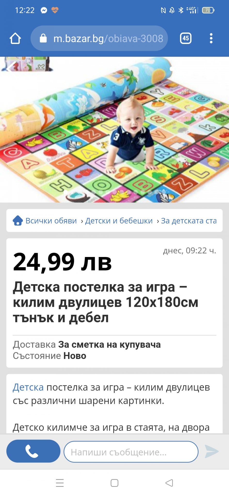 Момичета какви са тези цени за килимчета,абсурд.Ние имаме такова,въобще не го отразява дори.Баткото на четири се забавлява обаче усилено с него,с буквите и картинките най вече.Рано им е за такава шарении и превъзбуждане,аз го слагам директно на ламината по корем по няколко пъти на ден,иначе си лежи до мен и зяпа къде активната,къде някоя дрънкалка,къде прожектора/въртележката в кошарата.Редувам активната с шезлонг с изцяло легнало положение,извадих и летния кош и това е.Няма смисъл от много разнообразие и нови неща,за мен е рано.За на есен поръчах няколко играчки,включително и детски център вече след годинката са интересните играчки и неща 😁.