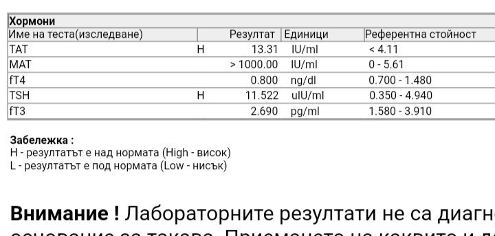 Аз нямам оплаквания, а ТАТ ми е 5 пъти над нормата... при рутинен профилактичен преглед преди година ми излезе висок АЛАТ, от там гастроентеролога го мъчи една година с разни хранителни добавки, накрая и писна и ме изпрати на ендокринолог, тя веднага каза, че има съмнения за Хашимото. Единственото ми оплакване е повечко килца, ама моите са от лакомия, едва ли проблема е в Хашимото. Холестерола за първи път ми е над нормата.