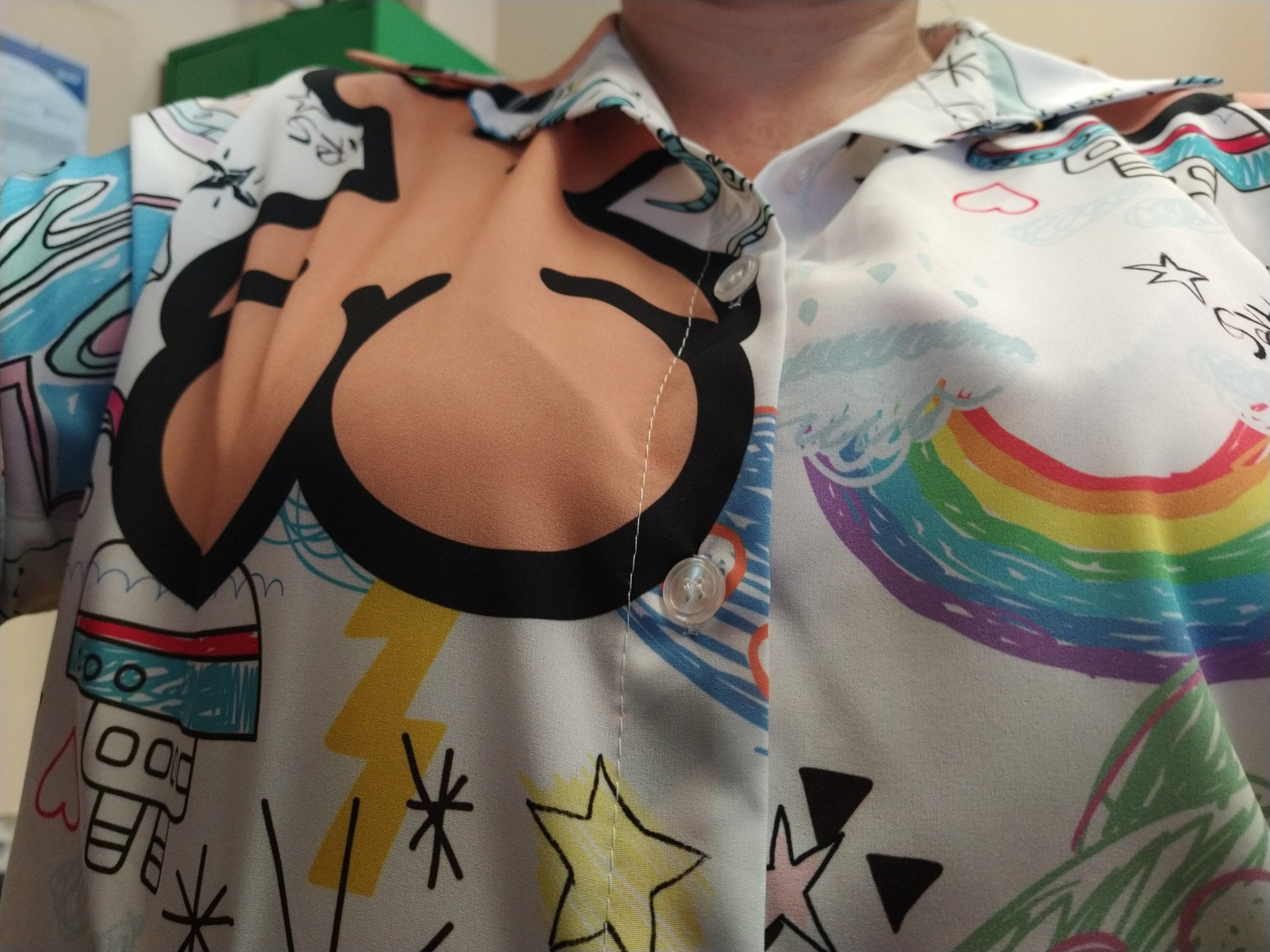 Аз днес съм с долнище на пижама на мечета и раиран потник.