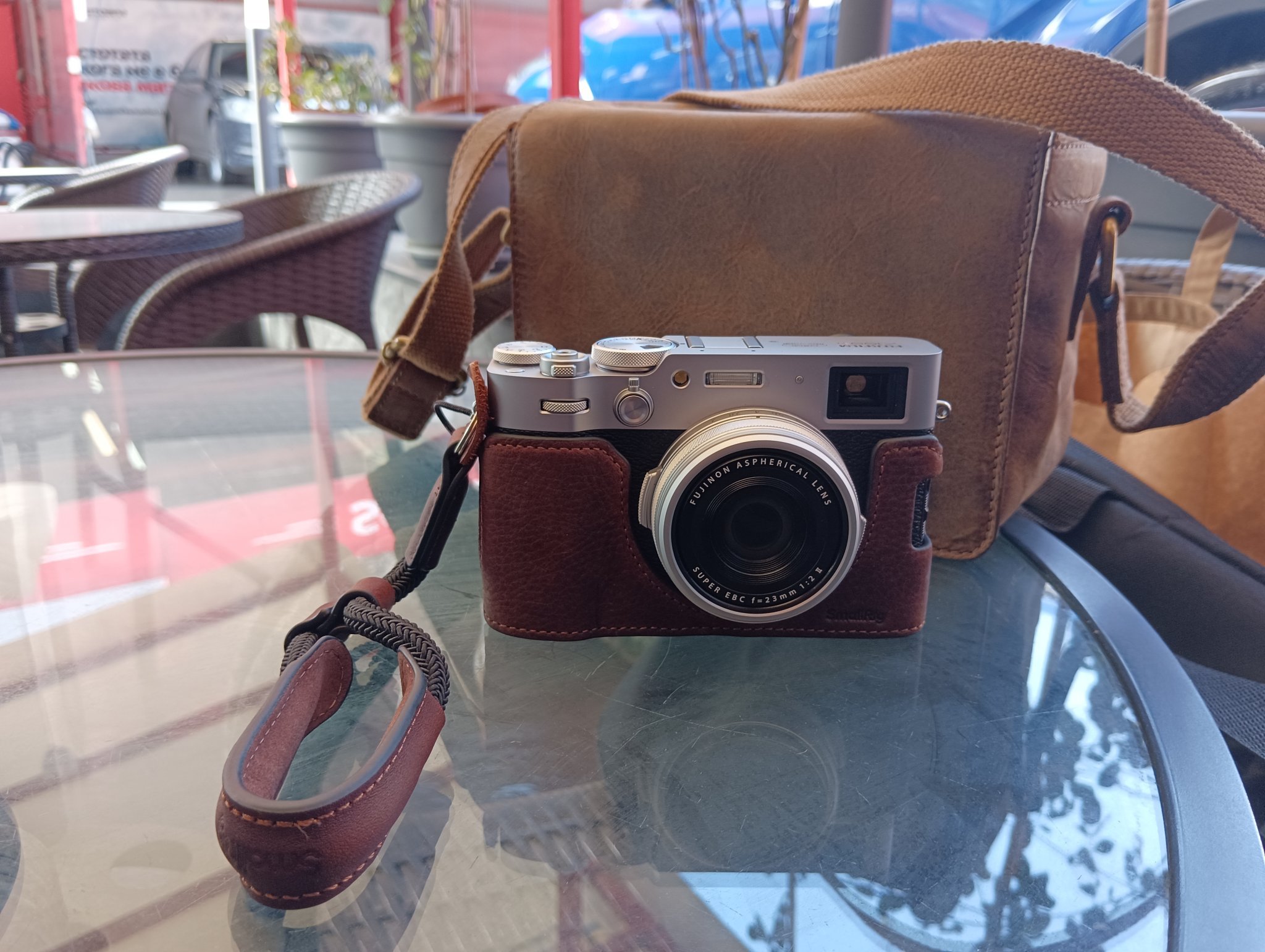 Междувременно оборудвах камерата и с кожен полукалъф във същия стил като ремъка за ръка и кожената фоточанта.