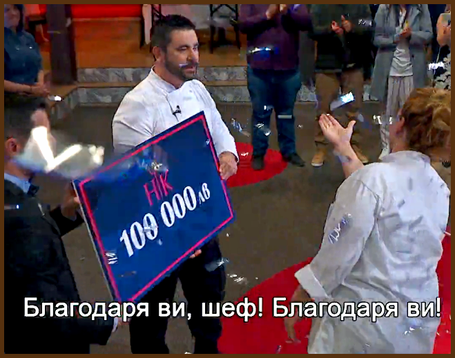 Както вече казах, абсолютно все тая ми беше кой ще спечели - моите фаворити Емил, Артур и Елена си тръгнаха, Камен също, и от тези тримата последни най-малкото зло беше Виктория. Но както казах и предположих - ще спечели Валентина. Е, спечели. Да ѝ е честита победата, това обаче не е моят победител. Няма да се повтарям и подесетвам, жената не си владее нервите, изпада в истерии, абсолютно не може да работи под стрес, забравя, заеква, не може да презентира дори собствените си творения, за обидите, които поне аз не съм забравила /как беше - писорана???/, и не само - как ли не наричаше почти всички от останалите, всеки един във всеки един момент, скандалите и почти вербалната агресия между нея и Деница /то и онази беше /, физиономиите, които постоянно прави, тиковете с глава и как си върти врата....диагнози не поставям, но се надявам тези 100к да ги използва за нещо различно от готвене, или ако си отваря ресторант, да е само мениджър без да участва пряко в готвене и ръководене. На фона на спокойния Дани Спартак, енергичната, но и съвсем различна като типаж Чилева, огън италианчето Реджи, "немската машина" не ми се вписва в картинката. А ако все пак е била толкова успешен готвач в Германия, патриотизма и това, че е българка да са били последното нещо, заради което да зареже успешна кариера там, за да се върне тук и да участва в ТВ шоу. На последно място изобщо не изключвам реверанс към неволната и нелепа травма на крака ѝ. Неприятно впечатление ми направиха и думите ѝ при отварянето на шампанското тази вечер към Виктория - когато ѝ каза, уж съвсем неволно, че "става повече за сервитьорка, отколкото за готвачка......"