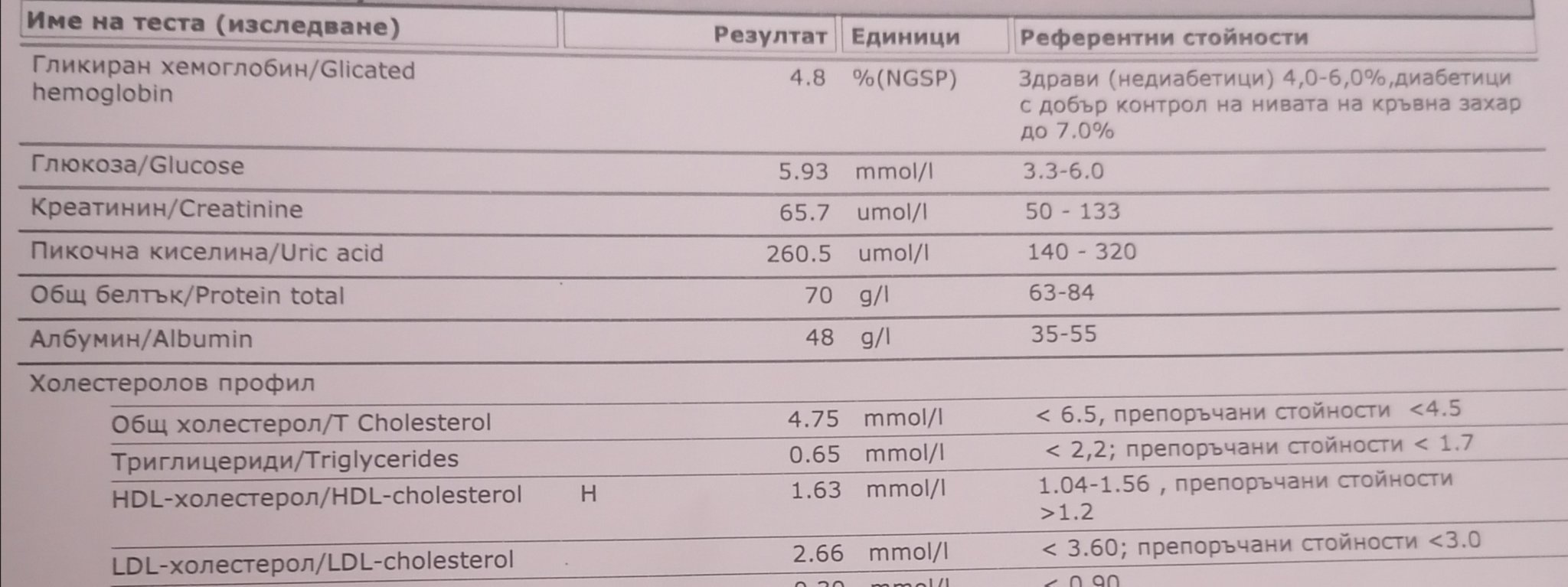Гликирания и мен ме изненадва, но все пак той дава яснота за време назад знам ли, пък аз може да съм в началото на проблема. А и аз от години избягвам въглехидрати защото не ми е ок от тях, задържам вода и се подувам,та знам ли може да е такъв затова. Иначе не съм на специална диета все още за да са такива резултатите, карам си на стария режим, ограничавам В, но не съм ги изключила напълно, а и тези дни и шоколад хапвах. Много се обърках вече и отчаях, личната отсече, че не е диабет и толко. А какво е един бог знае. Ето ги тези изследвания от преди месец още тук    става объркващо, ГХ изобщо не кореспондира с глюкозата на гладно.