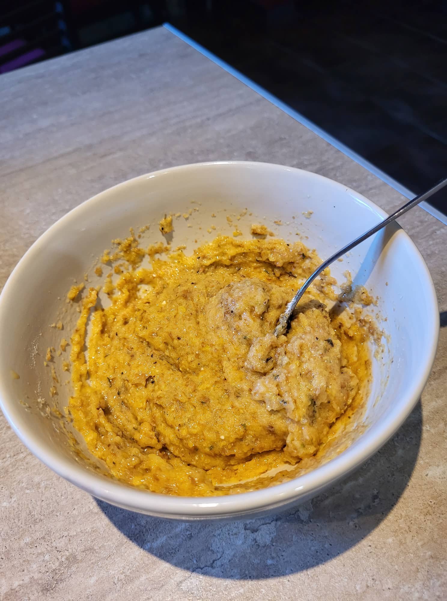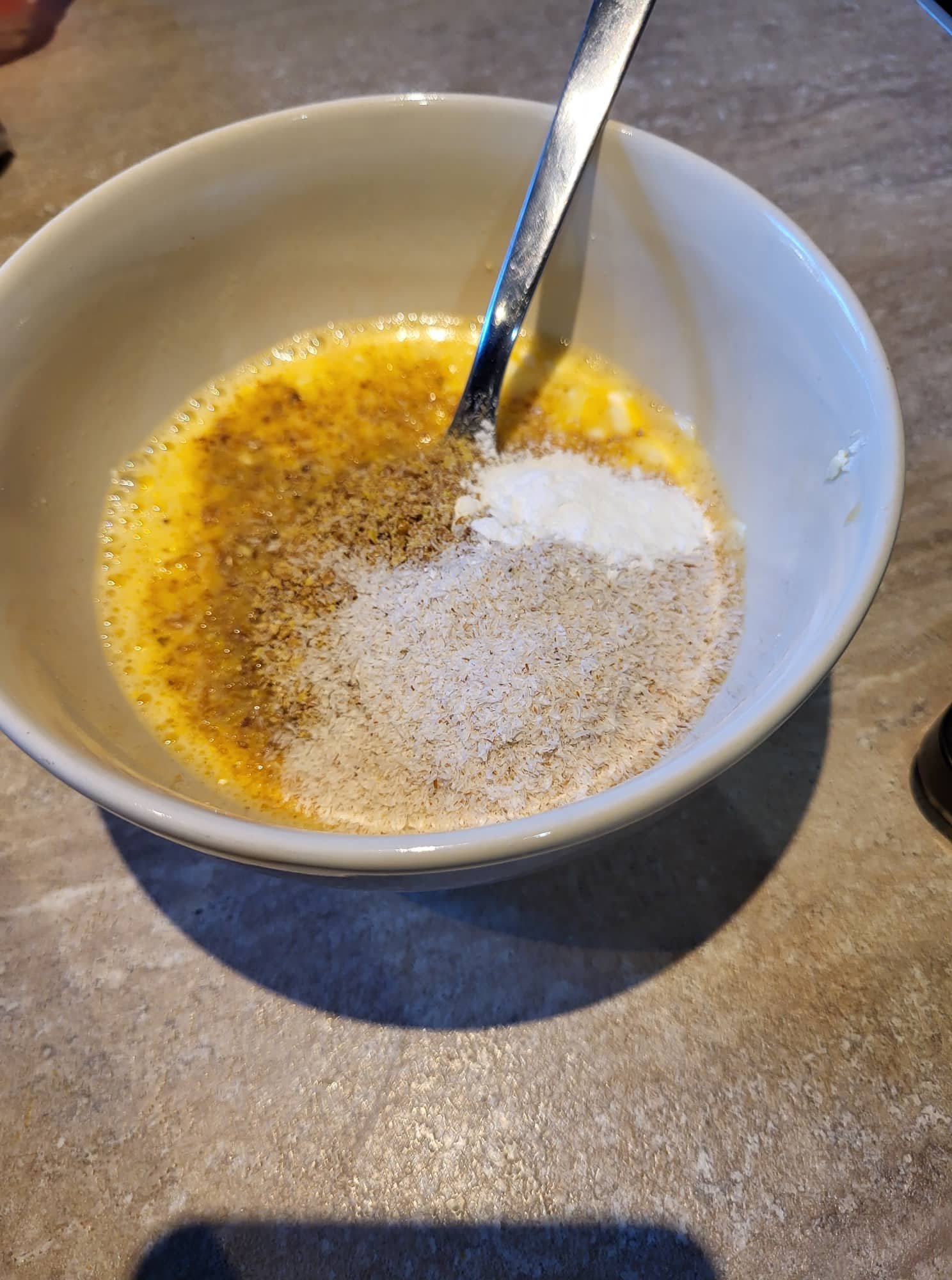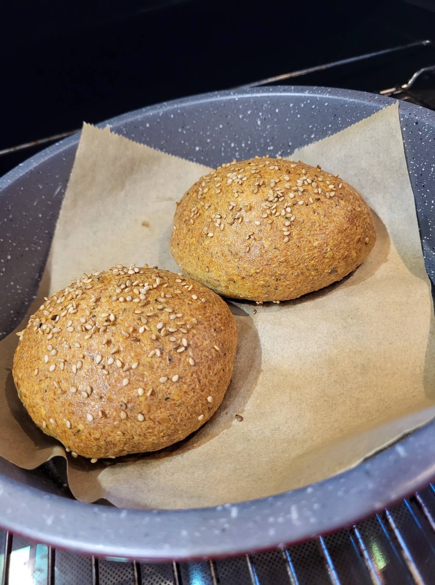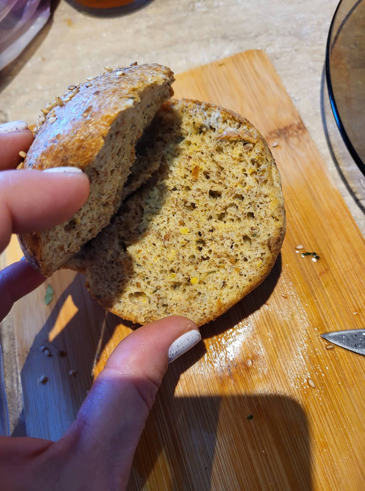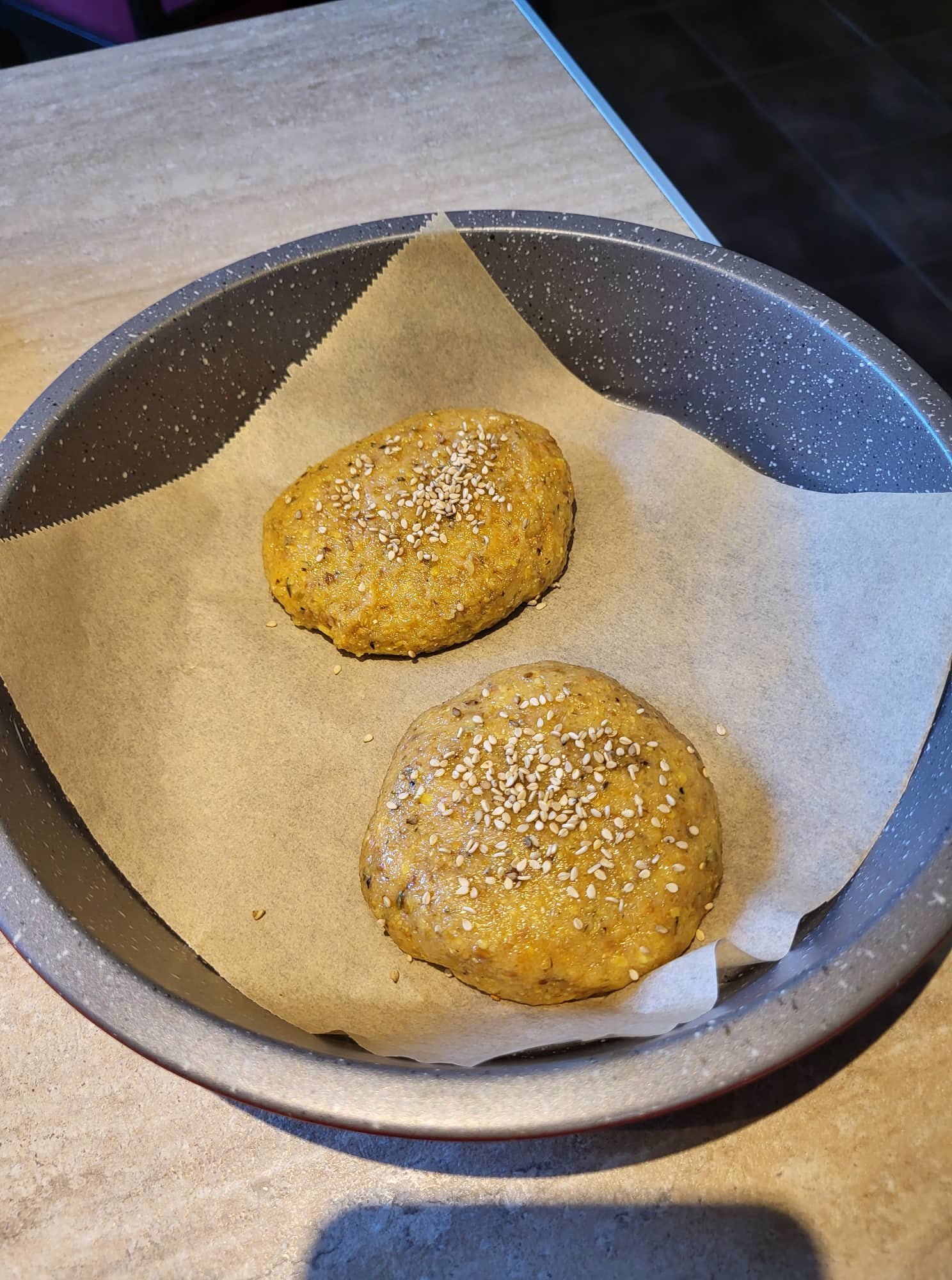 Спрях се на вариант с ленено семе/защото е с по-малко ВХ от бадемовото брашно/, но съм чела, че готовото натрошено, което се предлага в магазините се огранява/ ще пусна допълнителна информация относно ядките и семената/ купих си от ДМ златно  ленено семе-цяло, една малка кафемелачка и си го меля непосредствено преди приготвянето, а лененото семе държа в хладилника. Съставките са за 1 бр питка; 1 яйце , 1 и пол с.л ленено семе, 1 с.л хуск, 1 с.л крема сирене, 1 ч.л кокосово масло/разтопено/,бакпулвер и подправки...аз предпочитам по -силни като шарена сол и чубрица, че и лененото семе не е от най-вкусните 🙂 там всеки може да експериментира с каквото обича...Разбивам яйцето заедно с крема сиренето/с вилица/ добавям сухите съставки и кокосовото масло, получава се гъста лепкава смес и с мокри ръце оформям питката, слагам я в покрита с хартия за печене тавичка/поръсвам малко сусам/ и пека на 220 градуса във фурна без вентилатор за около 20 мин....за фурните трябва да се "нацели" времето, защото са различни, затова просто си следете да не изгори....МОже кокосовото масло да се замени с краве масло, но гледам да не прекалявам с животинските мазнини, затова предпочтеох да използвам кокосово....опитвам се да балансирам .....МОжете да експериментирате смело...аз съм правила много различни варианти, но този най-ми допада...