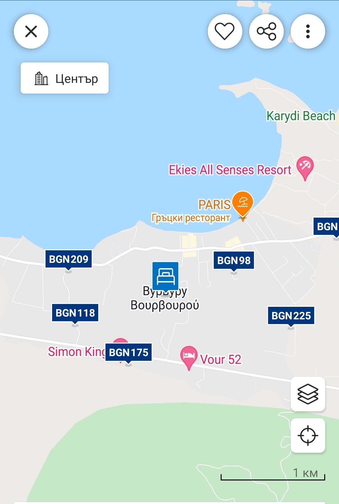 Давам снимка на местоположението на избрания от мен апартамент. Пише, че е на 150-200 метра от плаж Вурвуру, наблизо има супермаркет, плаж Кариди е на 1,3 км. Звучеше ми добре, докато не прочетох в някакъв блог, че този плаж е ужасен, каменист, мръсен и не става за ходене въобще, прекалено много лодки, които буквално могат да те прегазят, само частни плажчета, до които нямат достъп останалите хора... Моля ви за мнения и коментари. Ок ли е мястото?