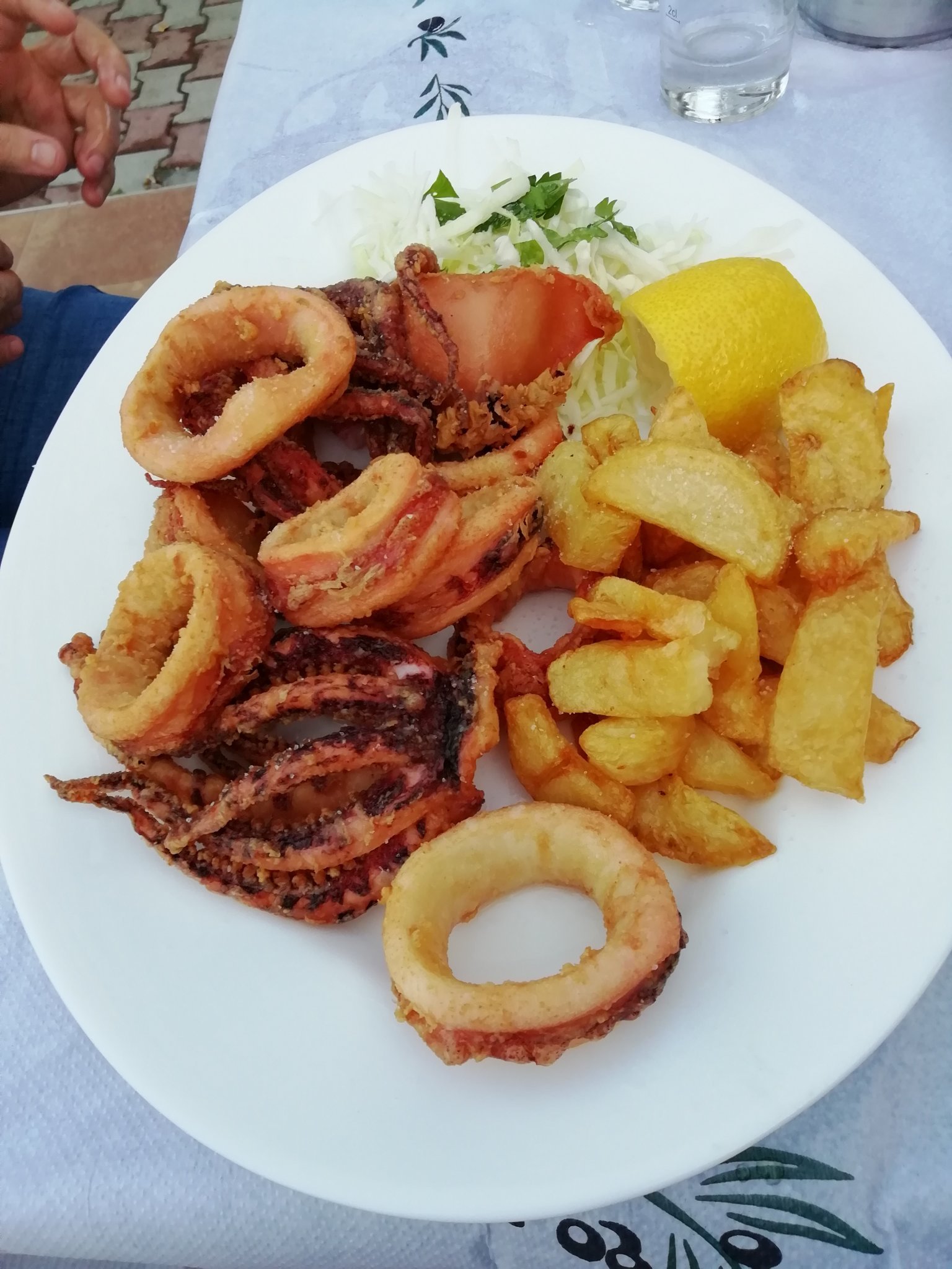 Относно калмарите и картофите - от десетина години насам сме поне по два пъти на сезон в Гърция. Мъжете ми поръчват само морска храна - скариди, калмари и октоподи. Да сложим, че се храним и на обед и вечер на заведение, представете си за колко поръчани порции говорим - никога не са ни сервирали порция калмари с картофи, дори не съм виждала на съседни маси да сервират такова чудо.