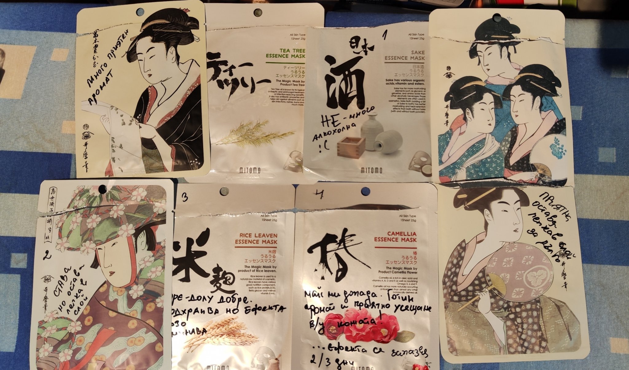 Mitomo Camellia Essence Mask-  Харесвам маските им и обикновенно ги взимам когато са на промоция или пускат абонаментна кутия .Тази е обилно напоена , даже прекалено успокоява , хидратира и озарява кожата бих повторила .