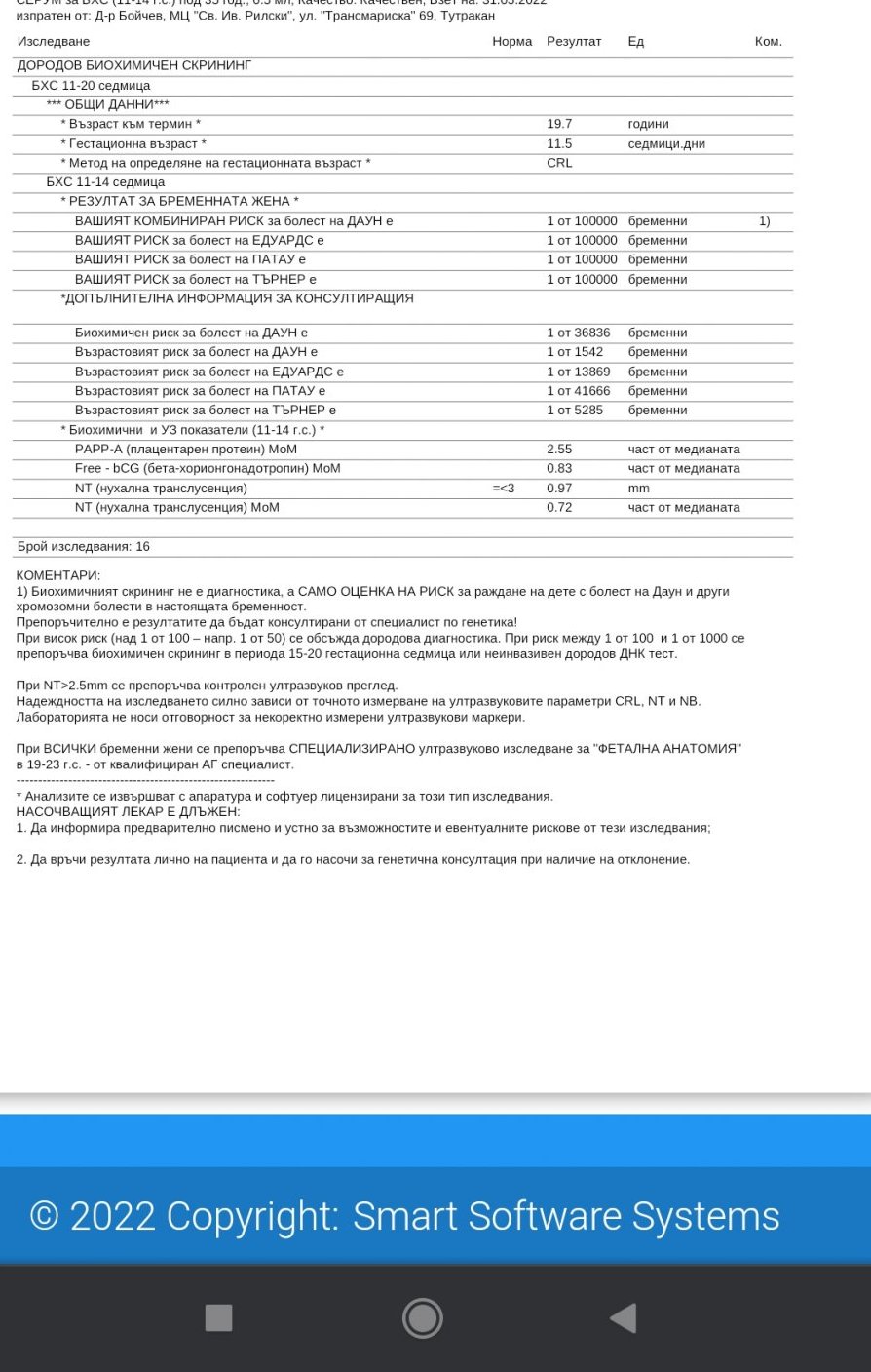 Лека бременост и успешен финал. Аз правих Prenatest и Gene safe.Останах доволна добра организация на 7ми ден получих резултата от Prenatest от Германия, а на 14ти резултата от Gene safe от Италия.,на единият ден на английски, а на следващия на бг от генетик. Виж и  другите момичета и си избери ТОЗИ КОИТО ЩЕ ТЕ НАПРАВИ СПОКОЙНА!
