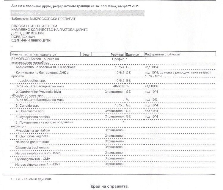 На кратко имам бяло течение от години... може би около 6 години... ходила съм по гинеколози, пускали са ми МБ... на някой излиза Candida Albikans.. през времето, а други излизаха чисти... течението си е все налично... Тази година реших да сменя гинеколожката си и след като обясних накратко историята ми, тя ми предложи да си пусна изследване - FEMOFLOR Screen показващ доста неща в секрета на ДНК ниво../прикачам резултат/