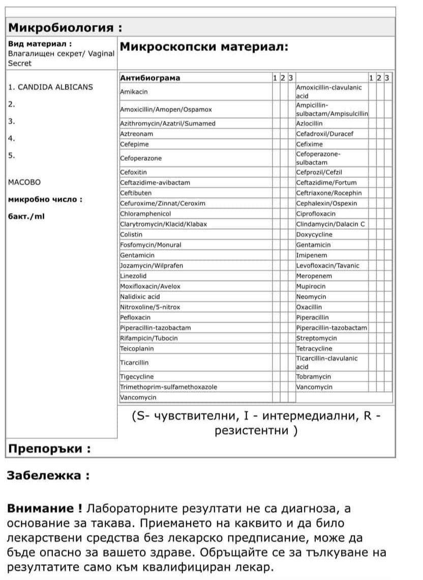 Ето резултатите ми от микробиологията . Ако може да ми обясните само кандида ли имам ? Бактериалната вагиноза съм я излекувала успешно ли ?