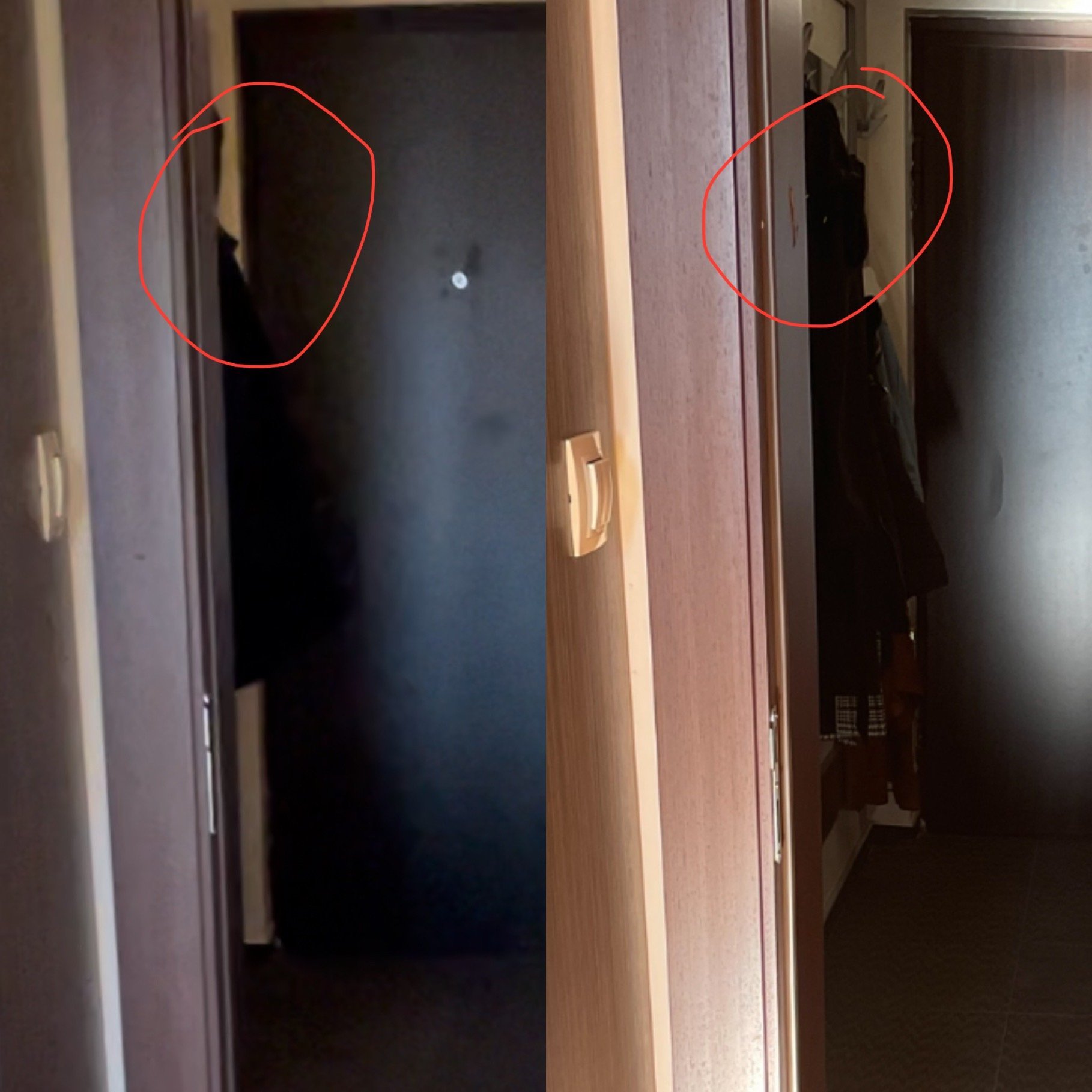 1 година,да. Винаги съм живяла сама в този апартамент,даже много си го харесвам. За вратата мога да допусна,че напълно съм изтрила от съзнанието си спомен как я затварям,но пак казвам-няма причина да го правя. Това с лампата повече ме озадачи,защото не мога да изтрия спомен как се качвам на стол да сваля абажура. Крушката продължаваше да си свети,не е за смяна. Първоначално си представих какво щеше да стане ако ми беше паднала на главата,та бях благодарна,че се е озовала в коша,когато не съм била там. Този ъгъл съм го набедила от много време. Месец,след като заживях там забелязах,че има вдлъбнатина/почти дупка в касата на вратата на спалнята. Все едно нещо много остро и тежко се е опряло. Ще кажа,че аз мебели не съм местила,нищо обемисто не съм пренасяла през вратата. Денят на нанасянето ми направих клипче да покажа апартамента на приятели. Когато видях въпросната вдлъбнатина прегледах клипа от първият ми ден там и изглежда като да няма нищо. Как се е появило месец по-късно не знам.