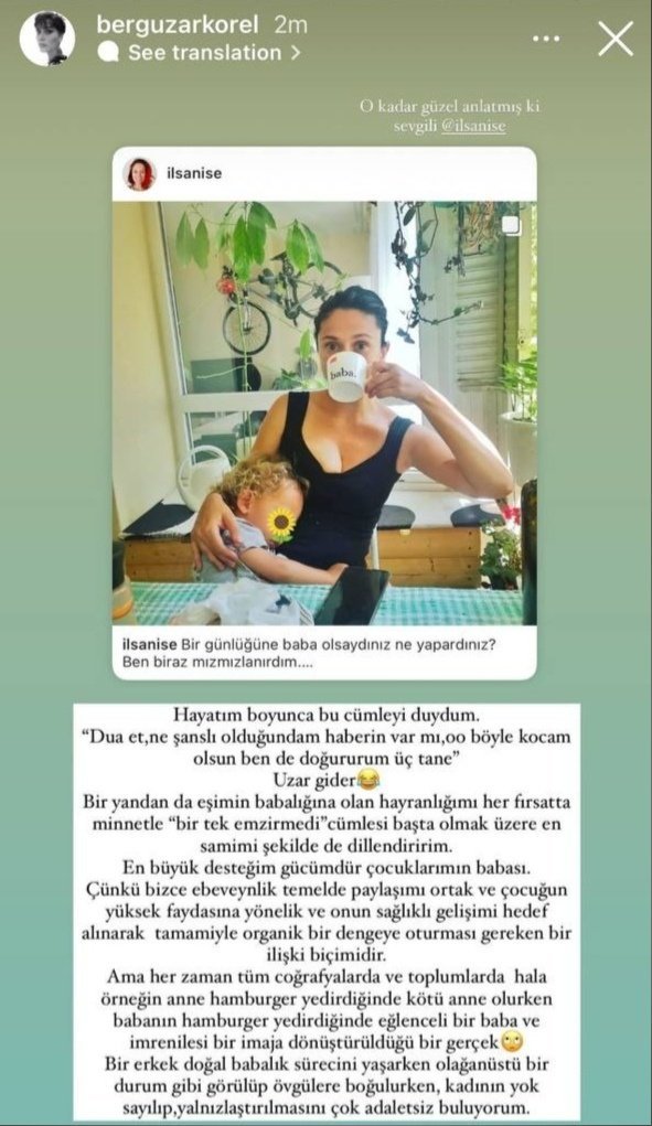Бергюзар ответила на пост Эсин Альпман, которая считает, что даже при равных усилиях мужчины и женщины в домайшней работе и при воспитании ребенка, похвала всегда достается мужчине...
