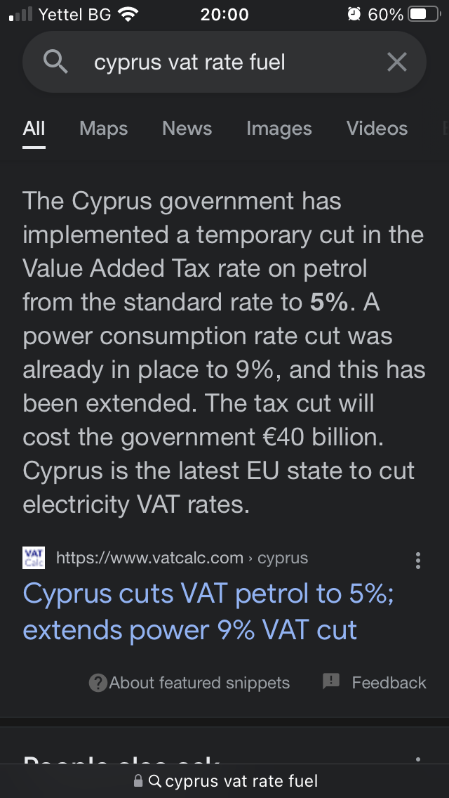 Не знам колко е петрола в момента, но в Кипър преди две седмици дизелът беше 1,30 евро. Нас като по-богати ни обясняват, че 3,20 - 3,30 лева за литър нафта били малко. Още трябвало да поскъпне. После, защо имало инфлация...!