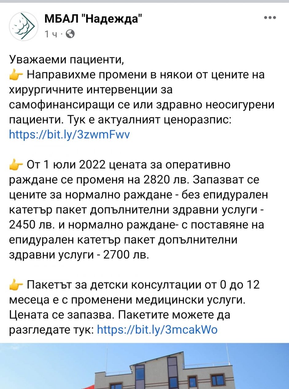 Видях, че сте коментирали днес болниците за раждане. Аз и друг път съм казвала,е ще бъде в Надежда. Някак най-сигурна се чувствам там. Та от първи юли ще има нови цени на ражданията.