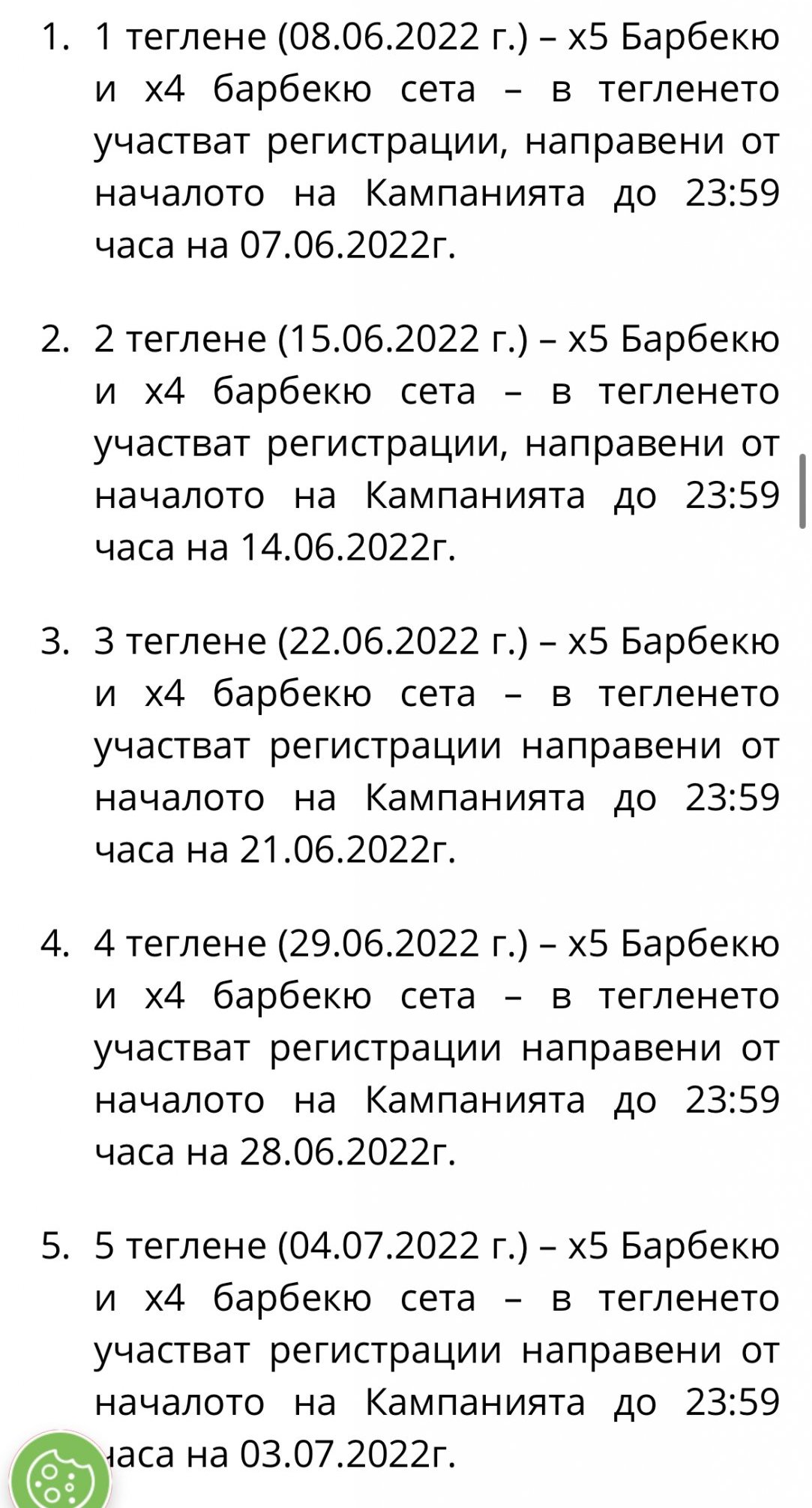 Според правилата са 5 тегления по 5 грила!До колкото помня 5*5=25! А в началото ясно си пише 50 барбекюта.Хайде моля и това да се поправи и едно барбекю за мен,че само ви намирам грешките!