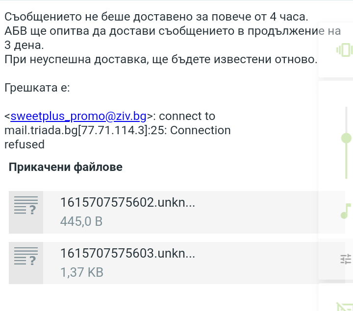 От Sweet + след като пратихте ЕГН и бележката отговориха ли ви че са получили данни.. Имам съобщение че не ми е доставено съобщението и вътре има 2 прекачени файла.. съмнявам се да не е вирус