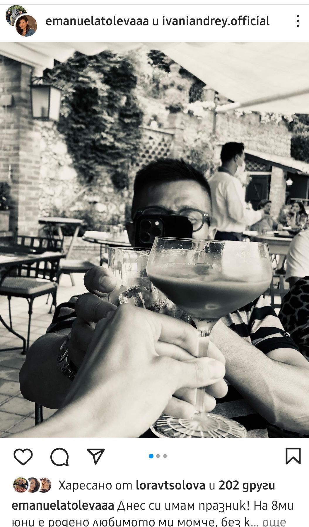 Само си представете как изглежда това отстрани. Седнали двама влюбени на вечеря, казват си наздраве , а всеки грабнал по един телефон и си снима чашата. Та и Емануела честити на своето момче , по пример на стрина. И няма предвид сина си.