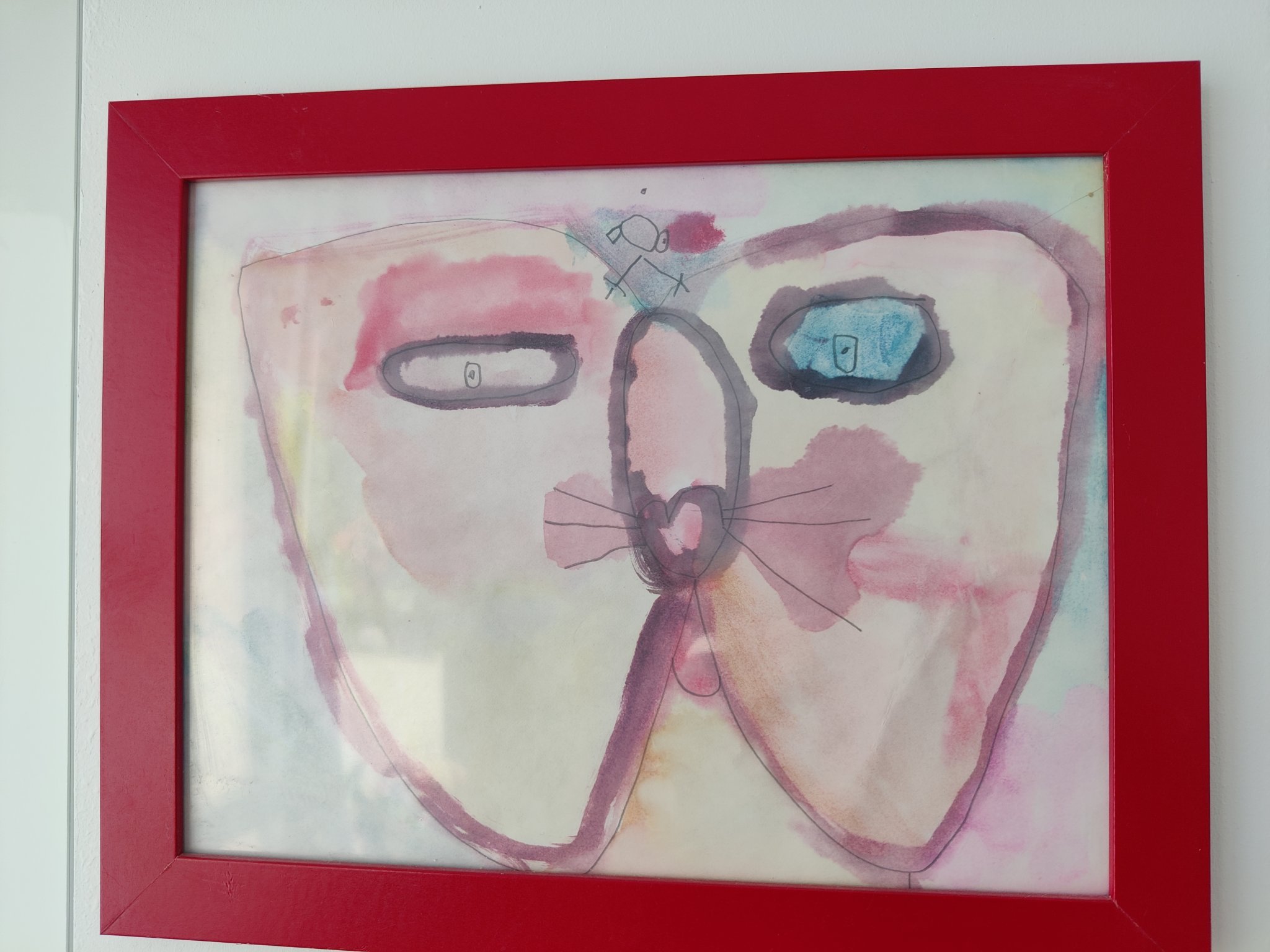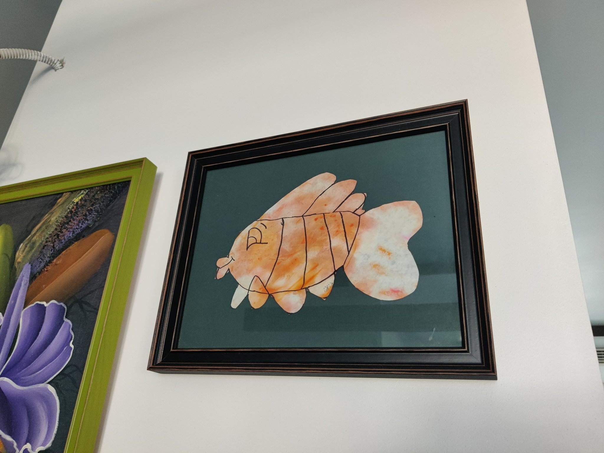 А това е първата му оцветена рисунка, рамкирана, че нали във всяка християнска къща трябва да има риба