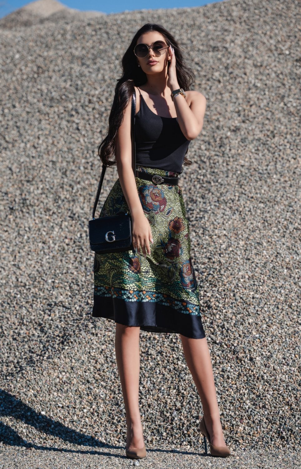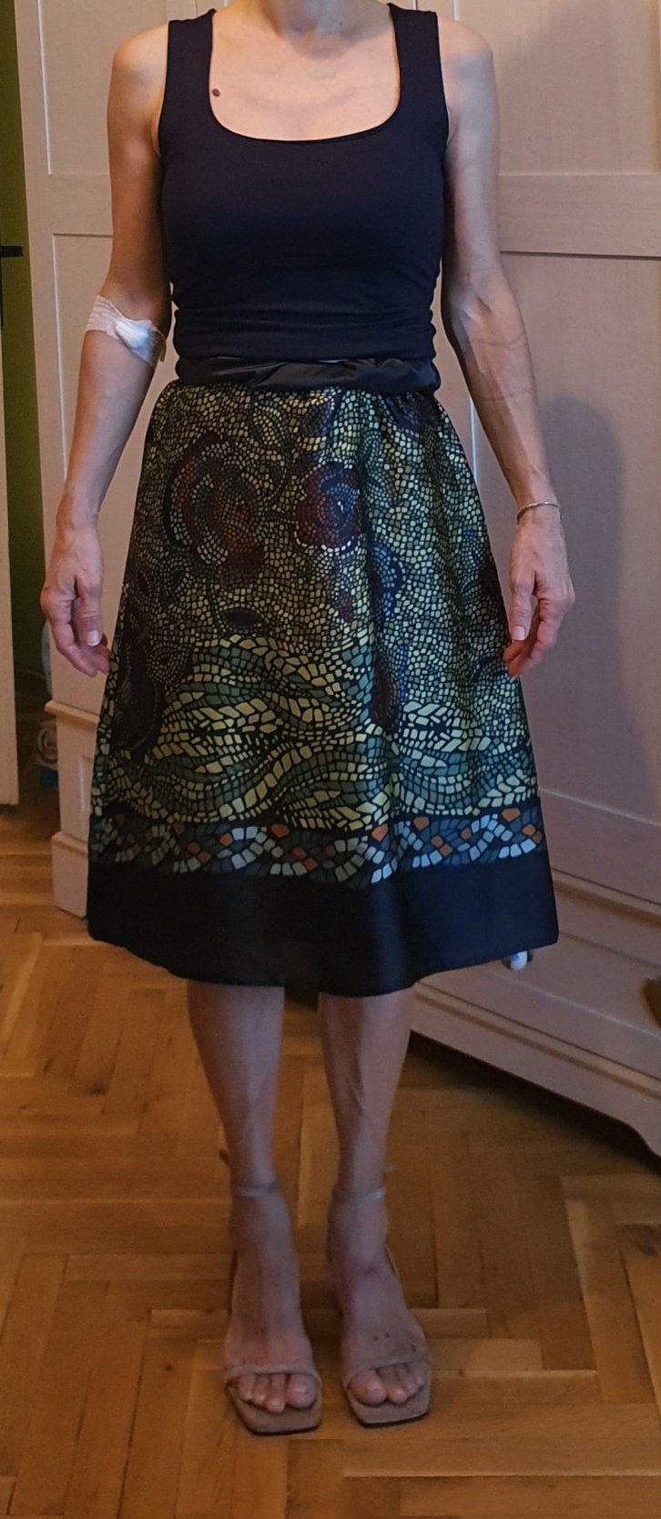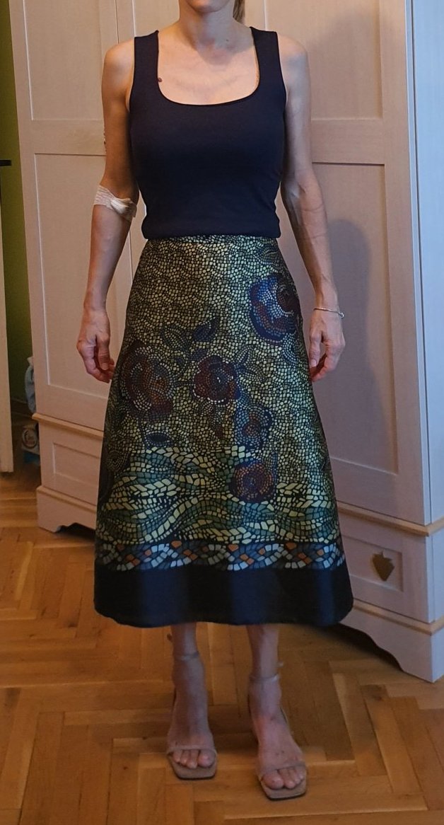 Аз бих я върнала. Изглежда сякаш е шита за 180+ см модел, просто е абсурдно да се рекламира за пола до коляното, а да е дълга почти до глезените. Имам подозрения, че и на снимката от сайта също е навита/скъсена да изглежда по-красиво.