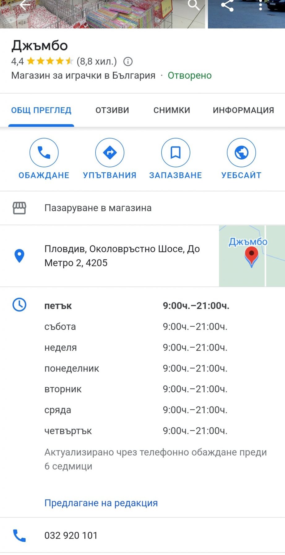Не знам доколко е актуална  информацията в гугъл за работно време  и затова  попитах.