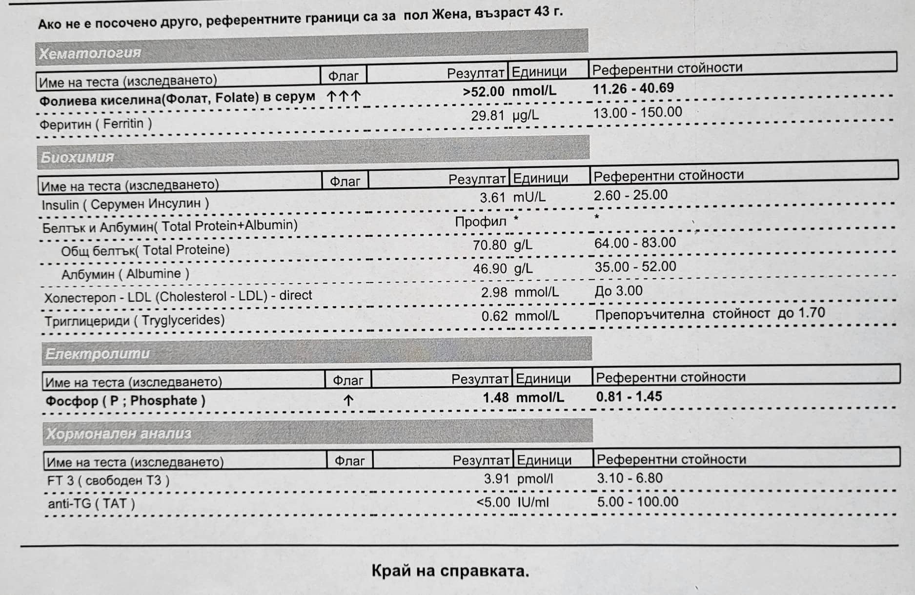 mibobo-Много ти благодаря:) Октомври за 1 път изследвах Фолат, заедно с Б12 - тогава пак беше леко завишен, затова сега го пуснах пак, но да- от тогава до сега съм приемала вит Б от всичките.....може ли да коментираш целите ми изследвания, повечето неща са ми ясни....но щитовидните не знам как да ги тълкувам....Хашимото-то се потвърждава, за него ми е ясно...Т3 е на дъното-хипофункция ли показва? Т4 не е толкова нисък.....Диагностицирана съм с Диабет тип 2 от септември 21г, и от тогава съм на Нисковъглехидратно хранене, възможно ли е от ниските ВХ да съм си скапала сама Щитовидните, или си е в следствие на Диабета.половите бях планирала дА пусна на 3-я ден от МЦ, но понеже бях с направление за тях, на което бяха и част от щитовидните, а така се оказа, че не успях на предния цикъл да отида до лабораторията, та днес ги пуснах с останалите, като съм 1 седмица след овулация, и съответно 1 седмица преди следващият МЦ-не знам колко са показателни, ама и те сега не са ми на преден план.....Глюкозата я дъжа под контрол с хран.режим и спорт..... Фосфора ми беше със същите/леко повишени стойности/ преди няколко месеца. От края на септември до края на декември свалих драстично 16 кг , от НОва година насам поддържам стабилни кг....63...спортувам активно във фитнес, като последните 2 седмици не съм ходила,защото съм в процес на смяна на залата/по лични причини/ На всички изследвания, които съм си пускала тромбоцитите първоначално излизат ниски, а при ръчно броене са ок, но от днес гледам че са по-скоро завишени, което показва разредена кръв....а повишеният хемоглобин май показва обратното, или поне така ми каза лекар, но може и да не съм разбрала нещо.....ошашакх се заради този фолат , и чак не знам какво да мисля, и не мога да се зарадвам на перфектните ми стойности на ГХ и КЗ Sad Първата снимка е от октомври месец, а другите от днес...
